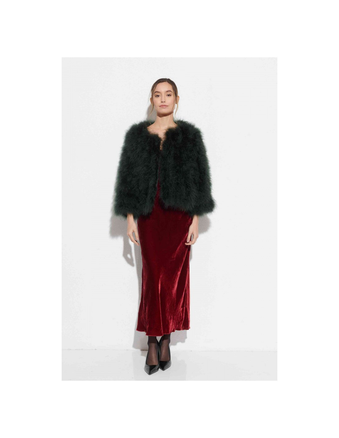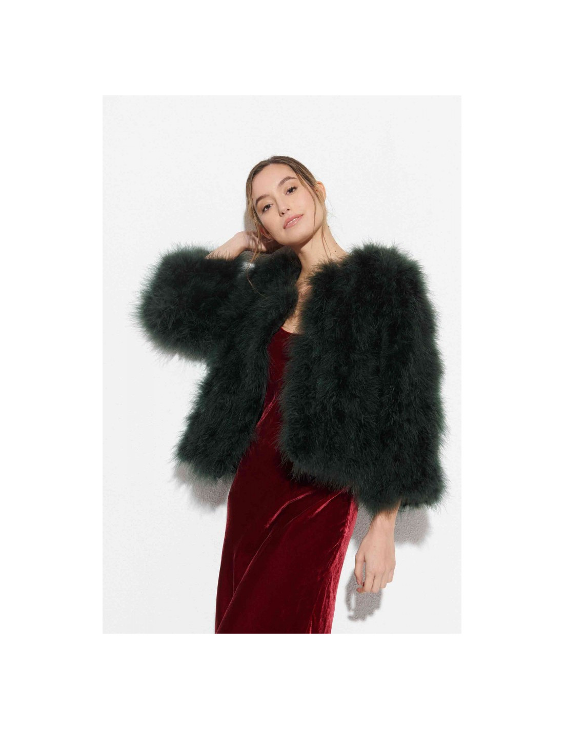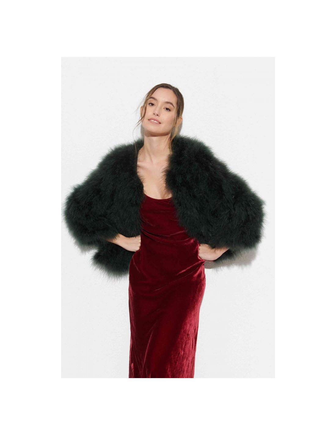 La chaqueta de plumas de avestruz en color verde oscuro es ideal para quienes buscan un look elegante y fresco en eventos invernales. Confeccionada con 100% plumas de avestruz, esta prenda es perfecta para bodas, cenas formales o eventos corporativos. Combínala con un vestido en tonos neutros como el beige o el gris, y añade accesorios dorados o en tonos verdes, como un bolso de mano y pendientes largos. Los zapatos en tonos nude o dorados completan este look sofisticado y acogedor.