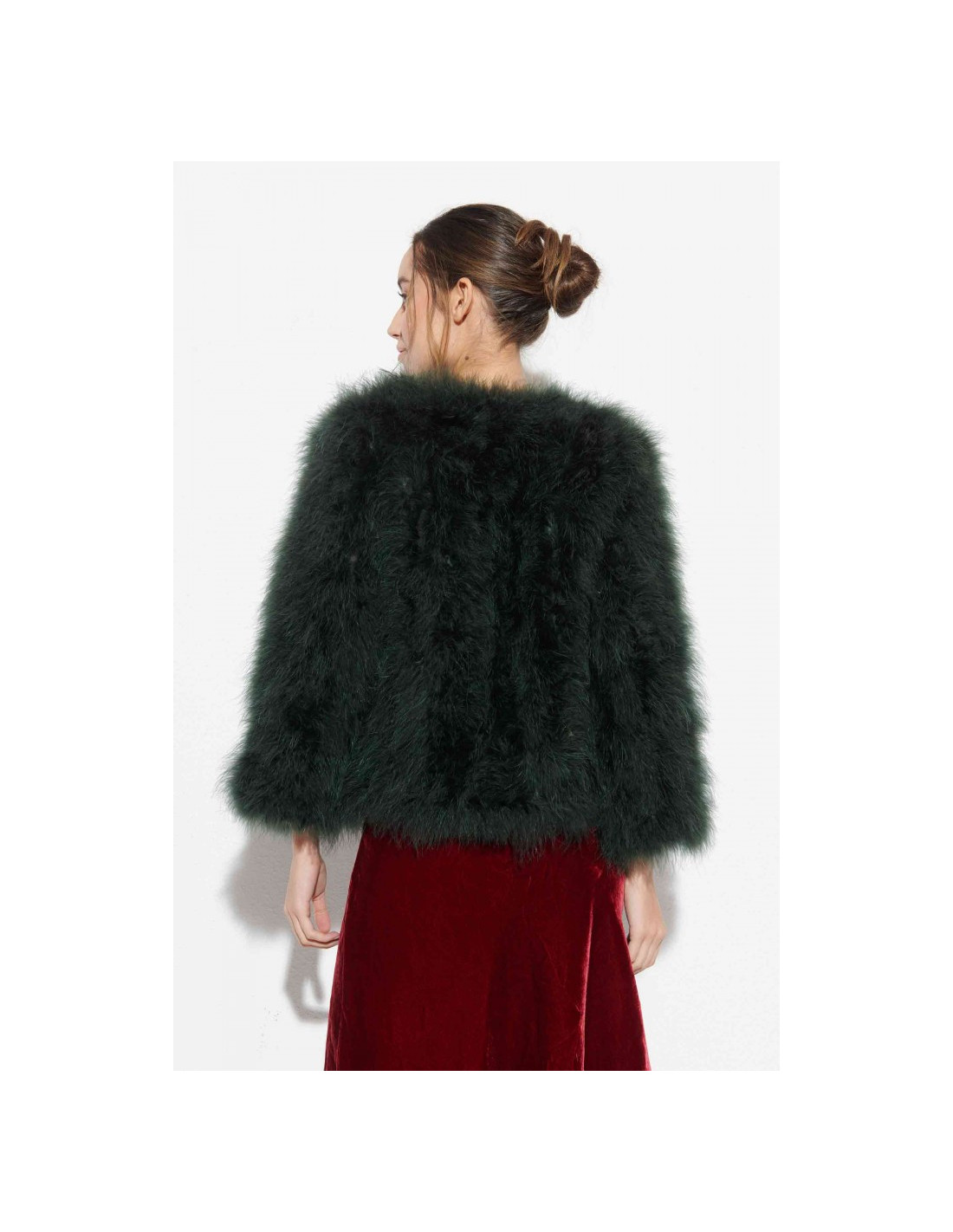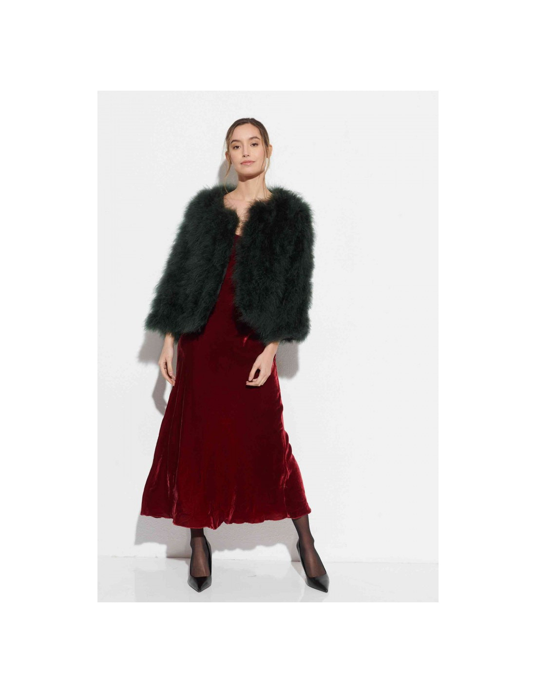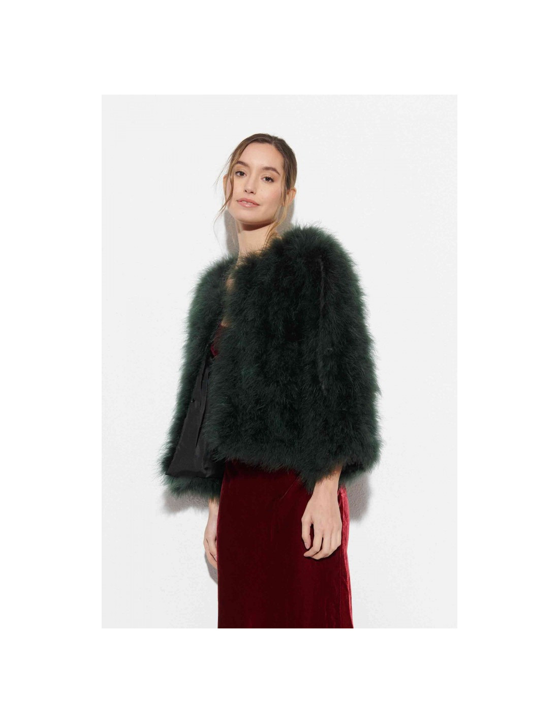 La chaqueta de plumas de avestruz en color verde oscuro es ideal para quienes buscan un look elegante y fresco en eventos invernales. Confeccionada con 100% plumas de avestruz, esta prenda es perfecta para bodas, cenas formales o eventos corporativos. Combínala con un vestido en tonos neutros como el beige o el gris, y añade accesorios dorados o en tonos verdes, como un bolso de mano y pendientes largos. Los zapatos en tonos nude o dorados completan este look sofisticado y acogedor.