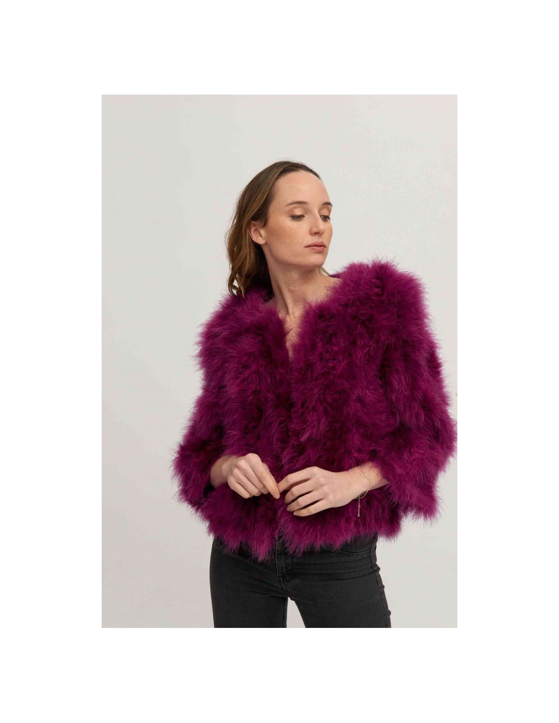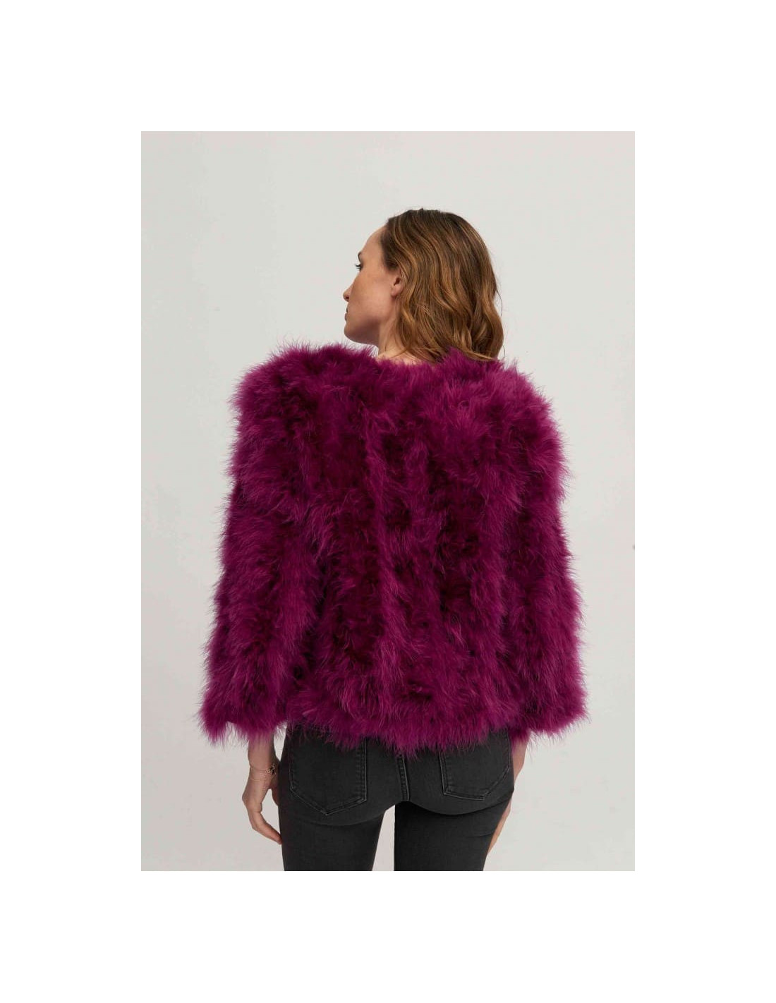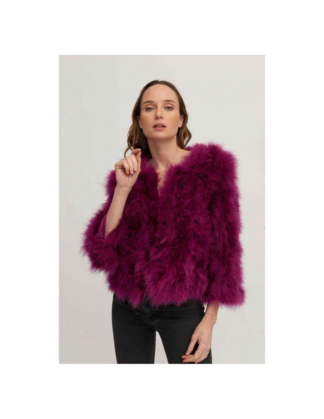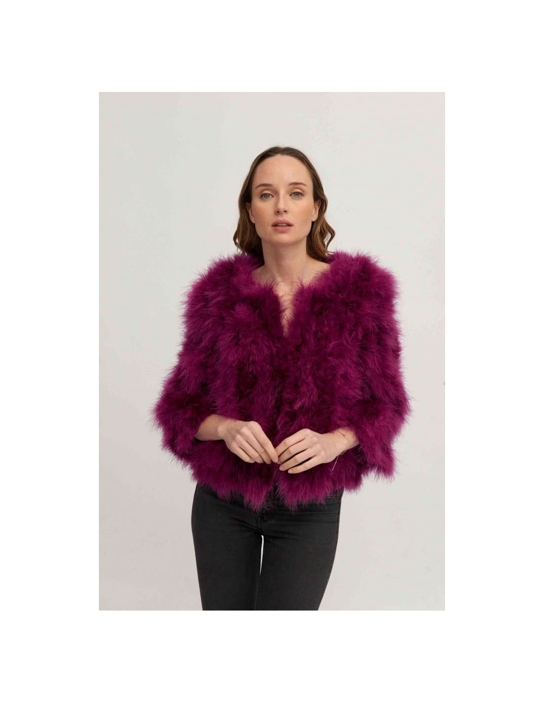Esta vibrante chaqueta de plumas de avestruz en color moradob es ideal para destacar en cualquier evento de invierno. Confeccionada con 100% plumas de avestruz, es perfecta para bodas, galas o fiestas de fin de año. Combínala con un vestido en tonos neutros como el negro o el gris, y añade accesorios plateados o en tonos buganvilla, como un clutch y pendientes largos. Los zapatos en tonos metálicos o neutros complementan perfectamente este look audaz y elegante.