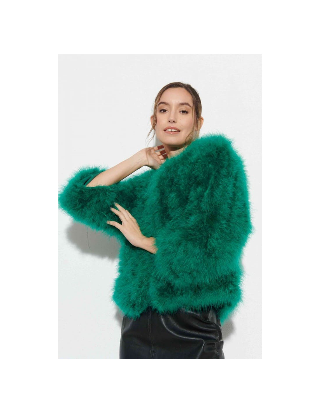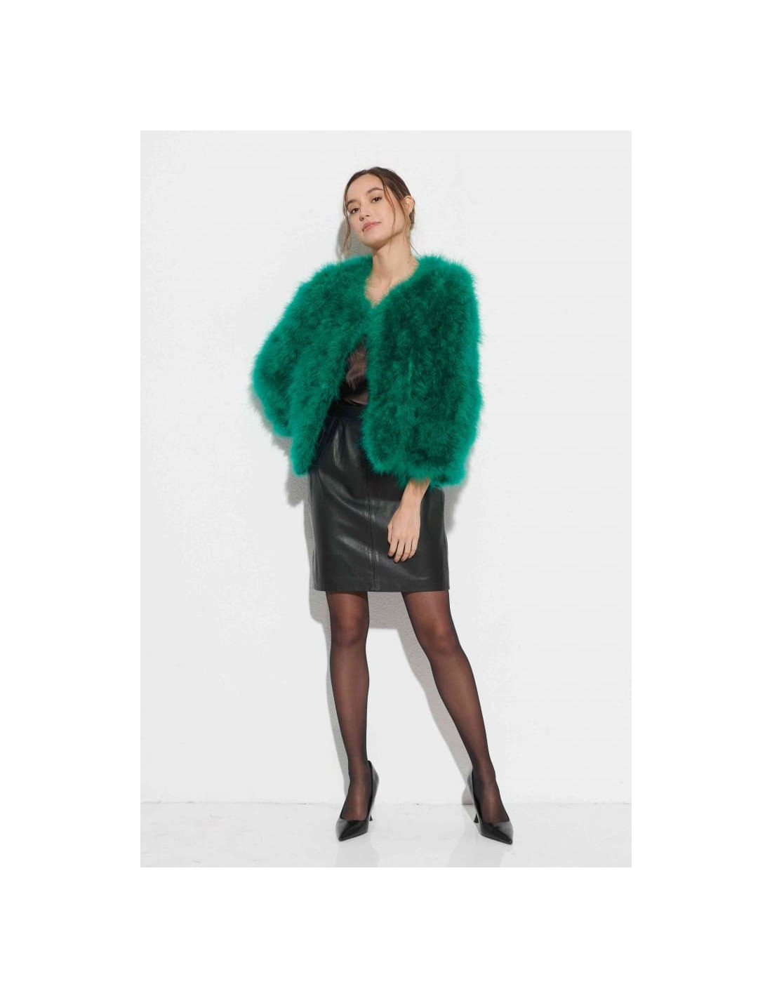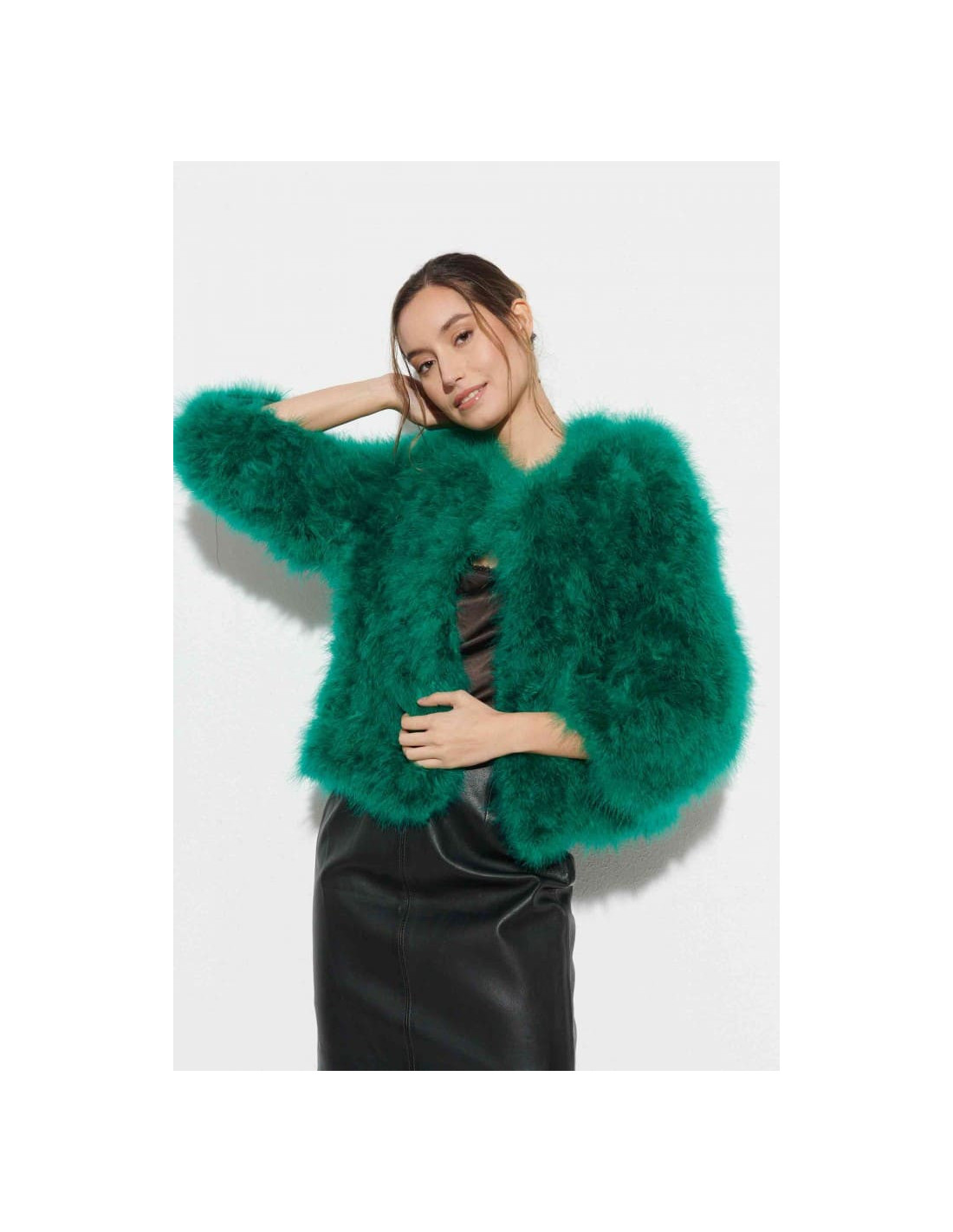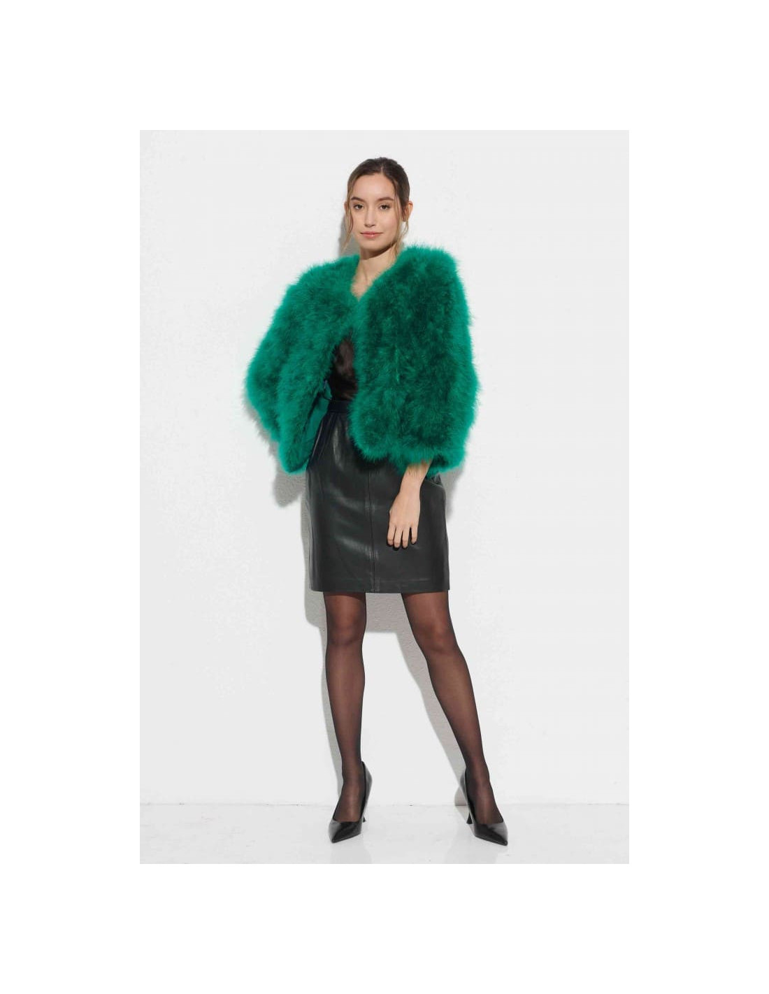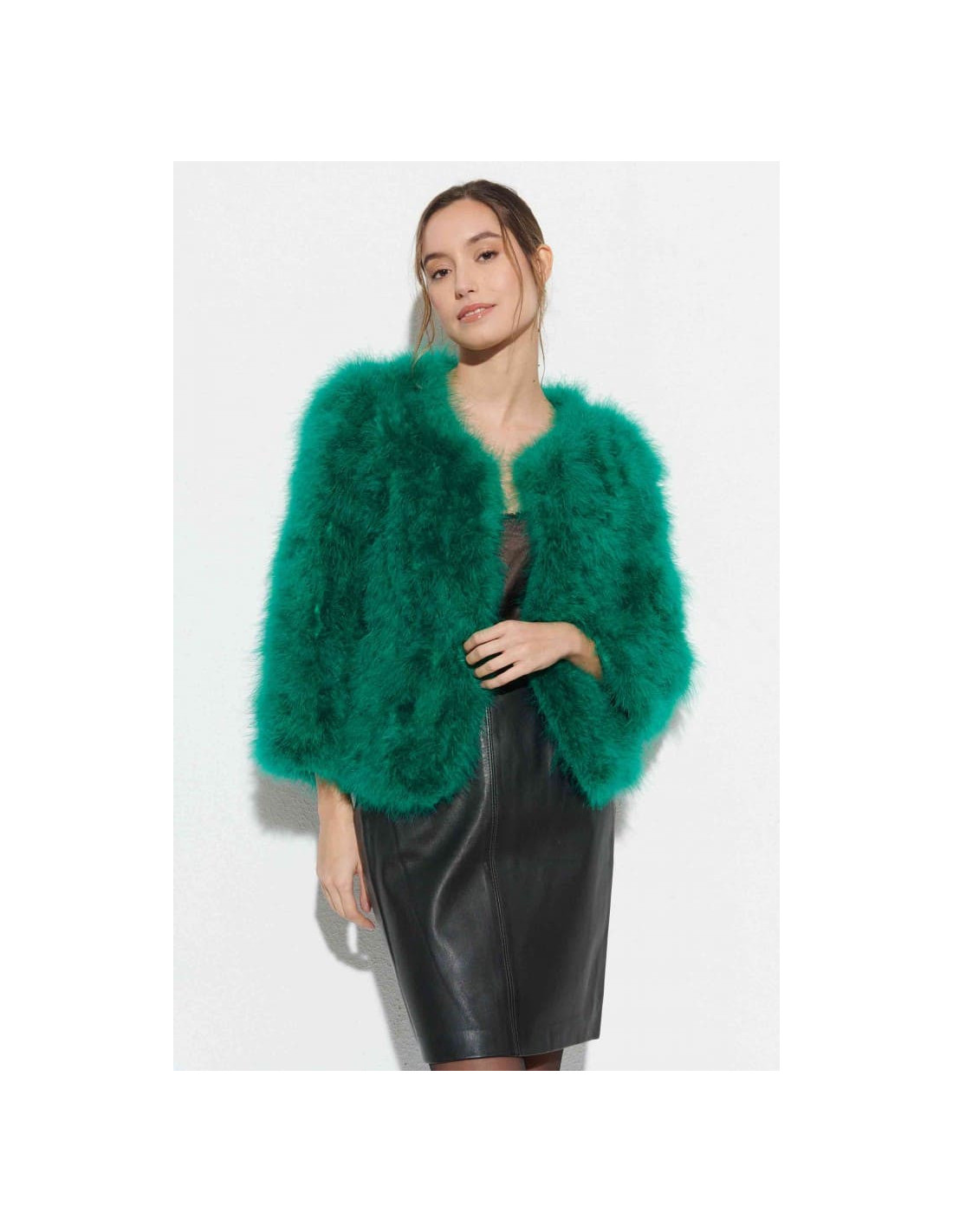 La chaqueta de plumas de avestruz en un vibrante color verde es la prenda perfecta para añadir un toque de frescura a cualquier look invernal. Ideal para bodas y eventos formales, esta chaqueta confeccionada con 100% plumas de avestruz destaca por su suavidad y estilo. Combínala con un vestido en tonos neutros como el beige o el gris, y añade accesorios dorados o en tonos verdes, como pendientes largos y un clutch. Los zapatos nude o dorados completan este look moderno y sofisticado.
