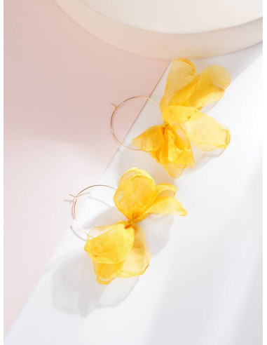 Los pendientes de aro con flor de tela son un accesorio delicado y femenino. Están disponibles en colores vibrantes como fucsia, mostaza, blanco, turquesa y beige, ideales para complementar cualquier look de fiesta o evento. Con su diseño floral, aportan un toque romántico y sofisticado a cualquier conjunto. Perfectos para bodas, bautizos, comuniones o incluso eventos de verano.