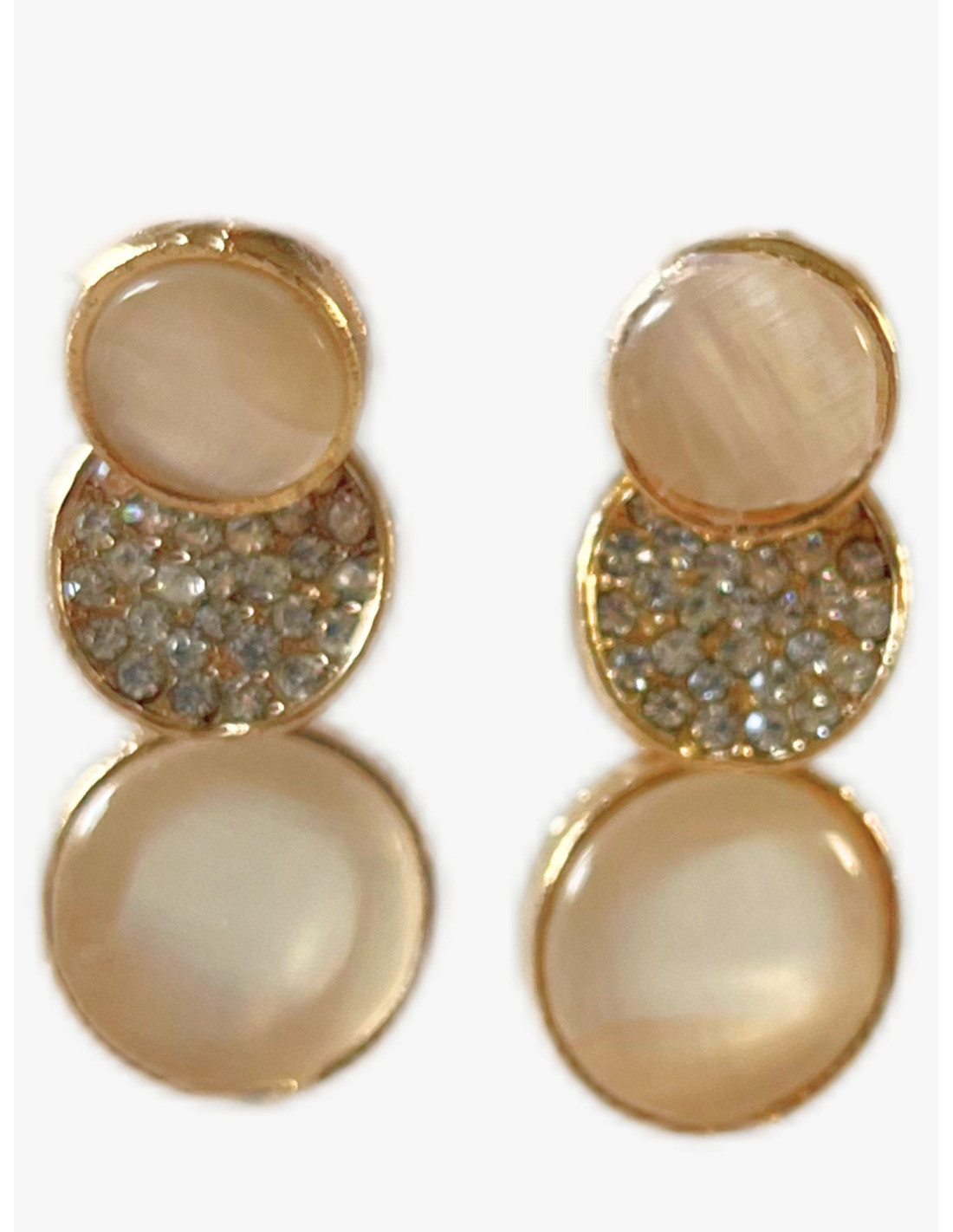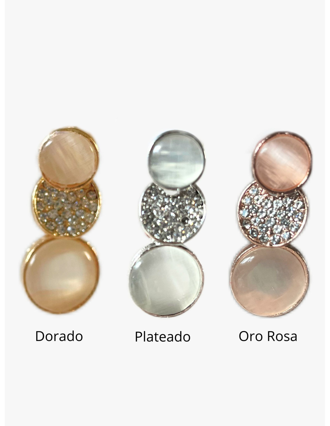 - Diseño de 3 círculos en cascada: Presentan un diseño moderno y elegante con tres círculos en cascada, dos de nácar y uno con brillantes, que crean un efecto visual atractivo y sofisticado.