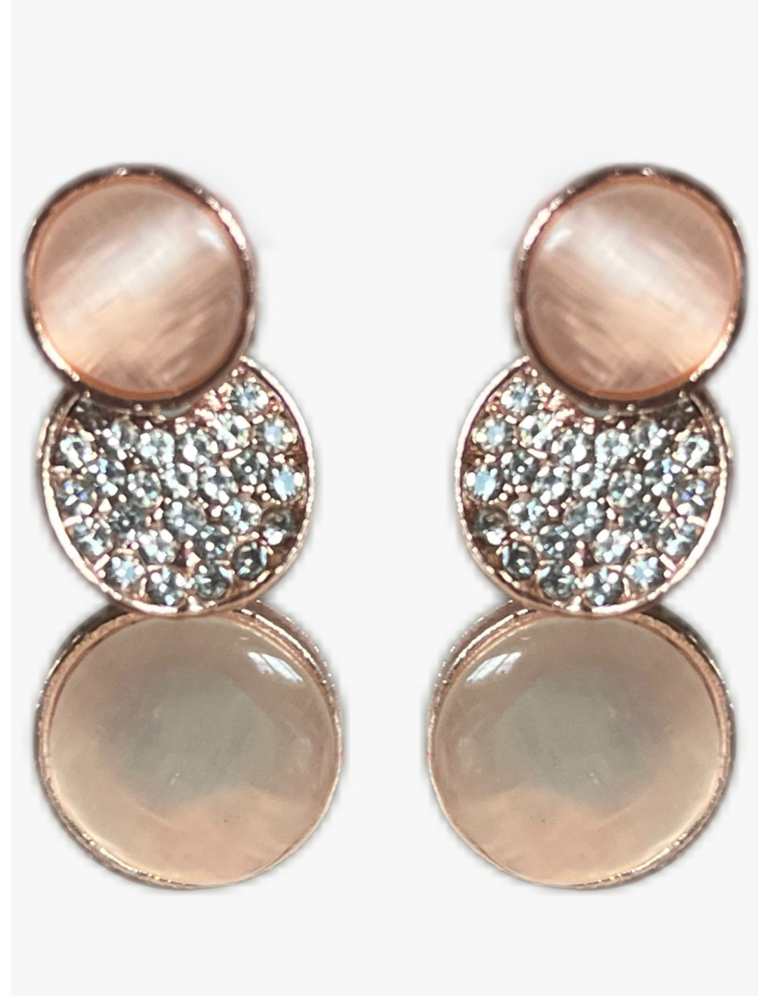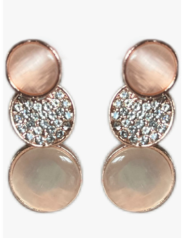 • Diseño de 3 círculos en cascada: Presentan un diseño moderno y elegante con tres círculos en cascada, dos de nácar y uno con brillantes, que crean un efecto visual atractivo y sofisticado.