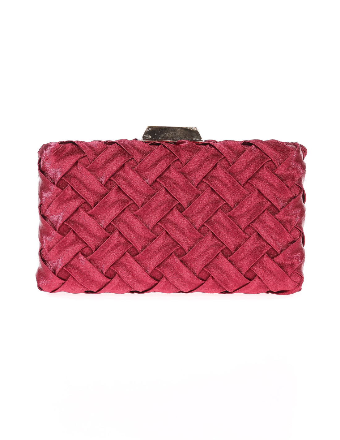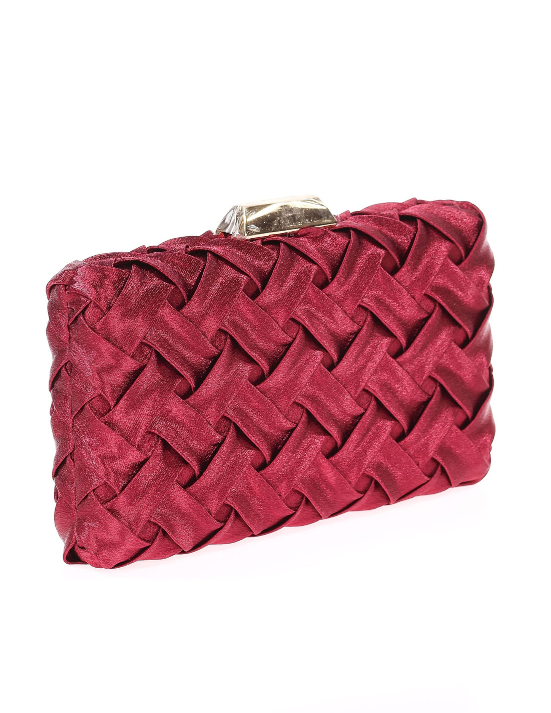 - Diseño: Clutch rectangular con detalles de tejido entrelazado que crea una textura elegante y distintiva.