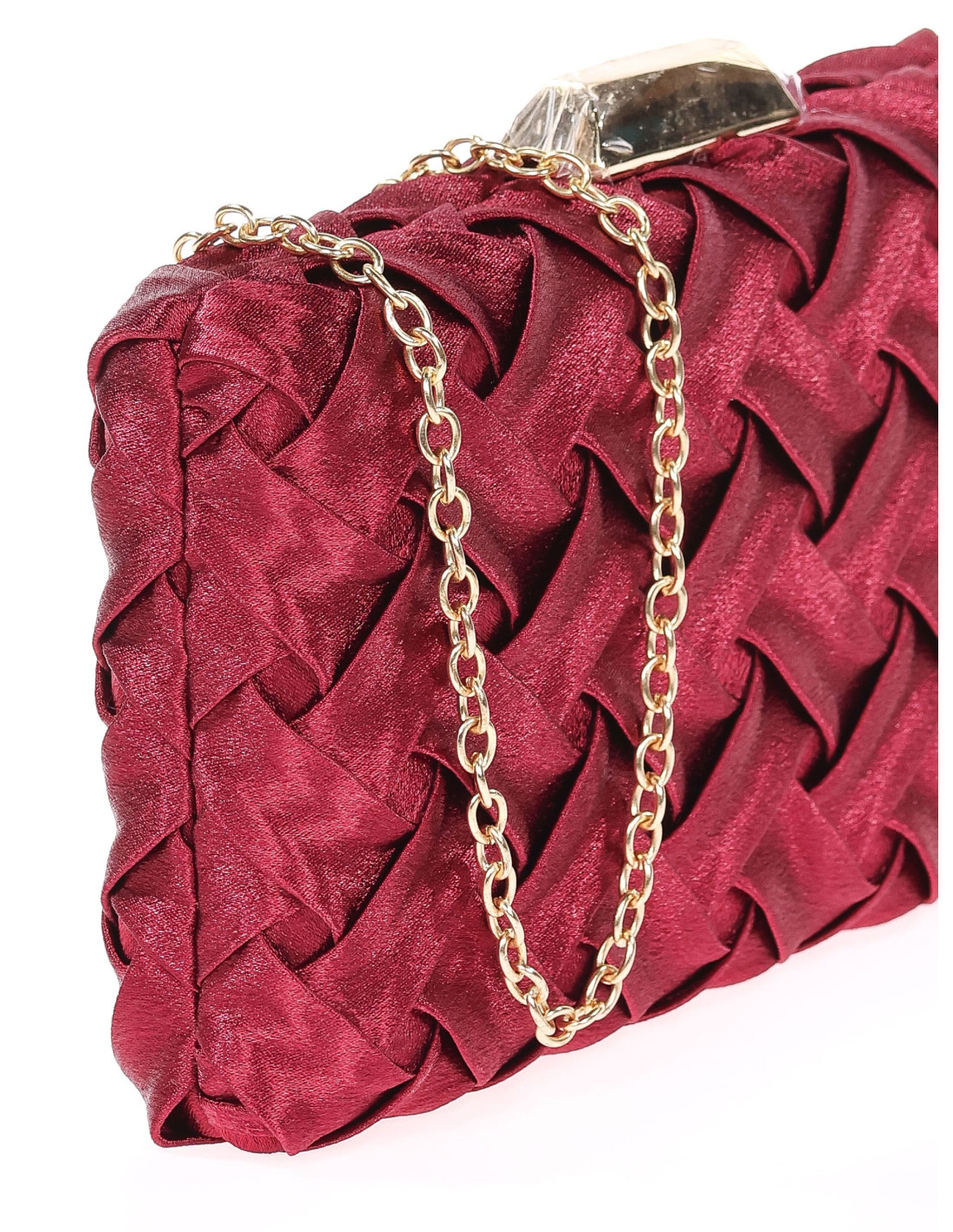 Este clutch de raso trenzado es la opción perfecta para darle un toque de sofisticación a cualquier atuendo de noche o de fiesta. El diseño entrelazado aporta una textura visual interesante, elevando el look de cualquier conjunto. Gracias a su variedad de colores (azul marino, verde oscuro, plata, dorado y granate), es ideal para combinarlo con vestidos de colores lisos o estampados que incluyan tonos complementarios.