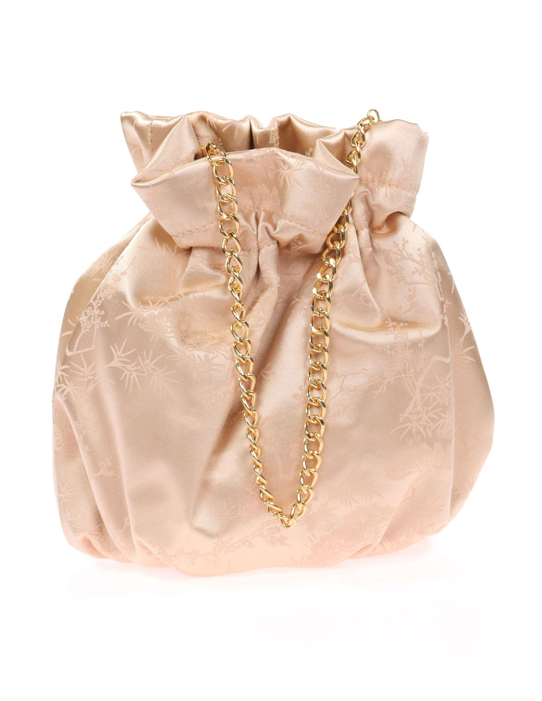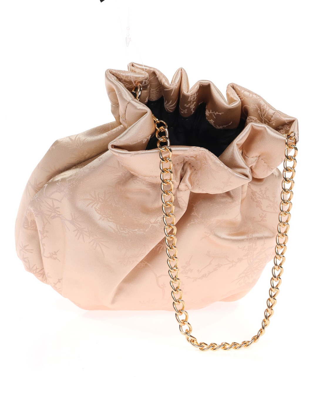 Bombonera satinada con estampado de hojas discreto, dibujado en la tela en un tono más claro, disponible en cinco colores elegantes: rojo, champán, negro, beige y blanco. Hecha de raso de alta calidad, esta bombonera es un accesorio imprescindible para ocasiones especiales. Su diseño versátil incluye un asa de mano y una asa de hombro en cadena dorada, lo que permite llevarla cómodamente de diferentes maneras. Con su cierre mediante fruncido, combina practicidad y estilo, manteniendo tus pertenencias seguras. Con un tamaño de 20 x 20 x 9 cm, es perfecta para guardar lo esencial en cualquier evento sin perder el toque sofisticado. El diseño discreto de hojas añade un detalle elegante sin ser excesivo, lo que hace que esta bombonera sea perfecta para complementar cualquier look formal.