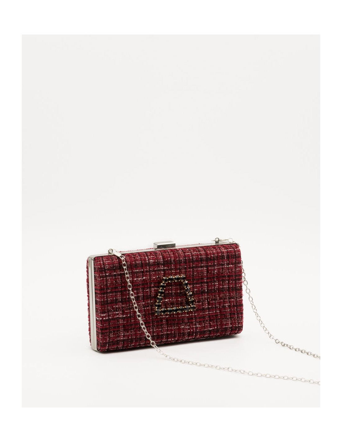 Bolso de fiesta estilo jacquard, disponible en los colores negro, verde, vino, beige y camel. Este bolso de diseño exclusivo complementa perfectamente tus looks más elegantes. Con cierre seguro y cadena desmontable, es ideal para llevar al hombro o como clutch. El detalle en pedrería en el centro le añade un toque sofisticado, haciéndolo un accesorio perfecto para cualquier evento especial.