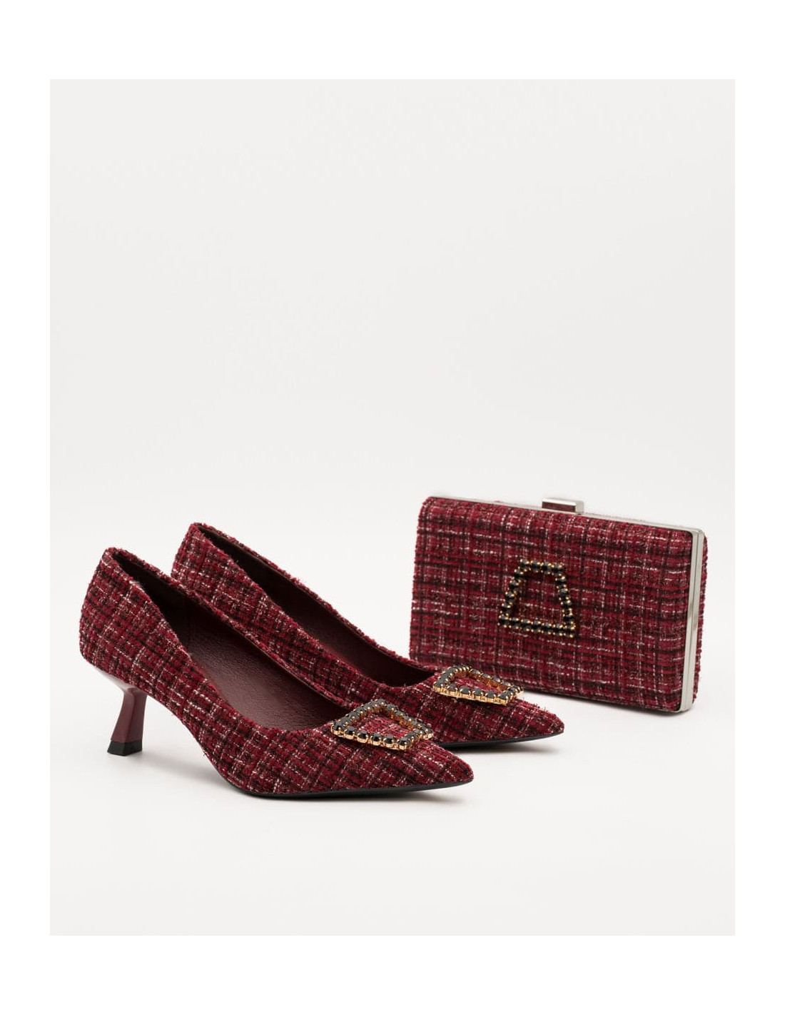 • Boda: Vestido midi burdeos + abrigo negro + tacones negros + bolso rígido negro con detalles dorados.