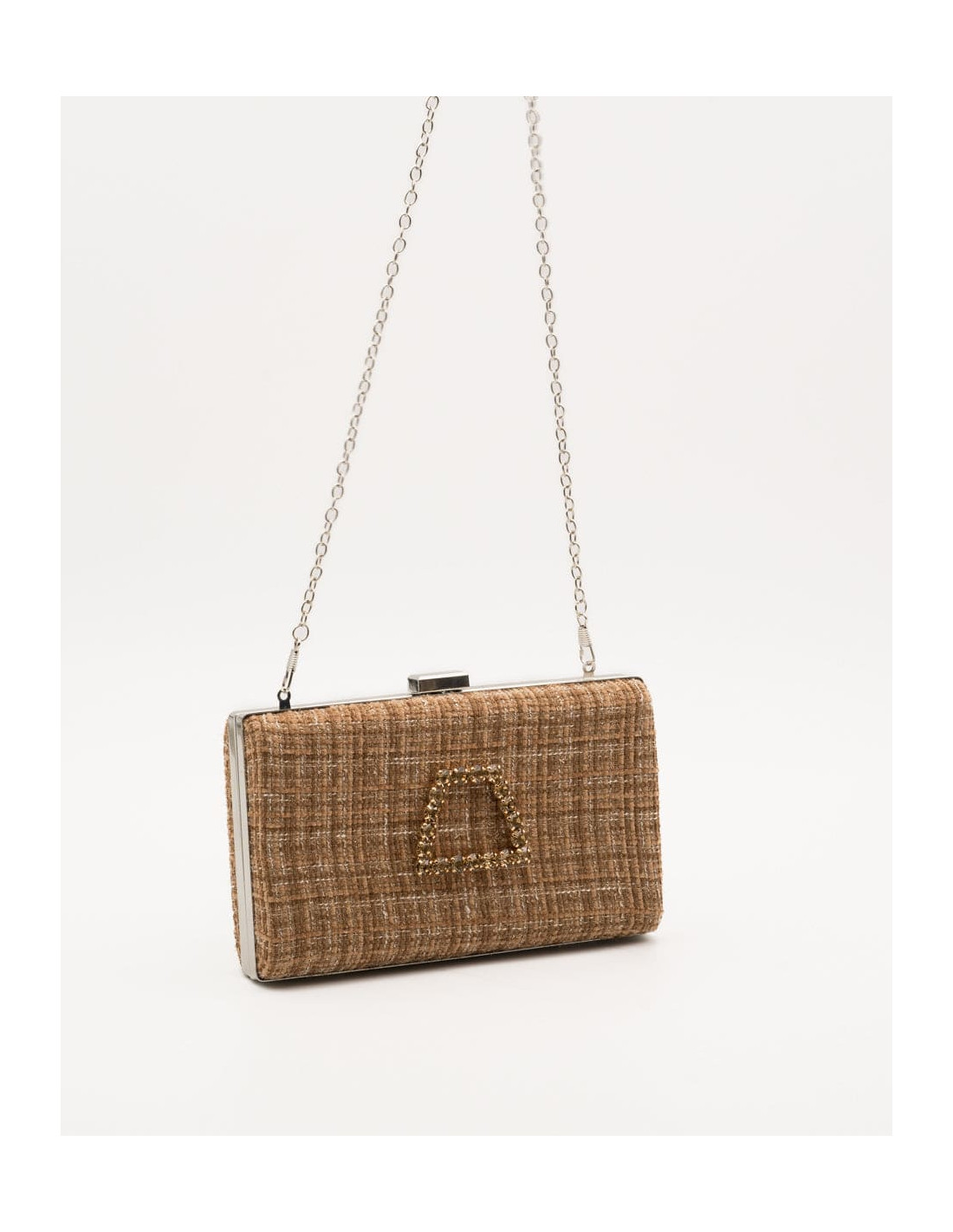 Bolso de fiesta estilo jacquard, disponible en los colores negro, verde, vino, beige y camel. Este bolso de diseño exclusivo complementa perfectamente tus looks más elegantes. Con cierre seguro y cadena desmontable, es ideal para llevar al hombro o como clutch. El detalle en pedrería en el centro le añade un toque sofisticado, haciéndolo un accesorio perfecto para cualquier evento especial.