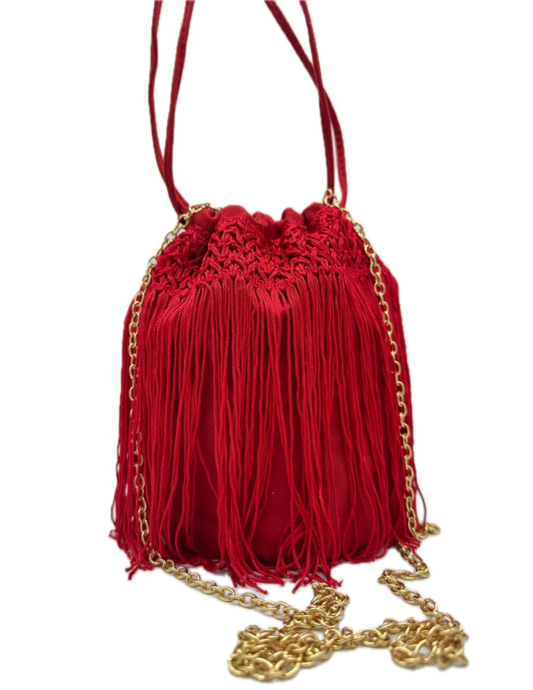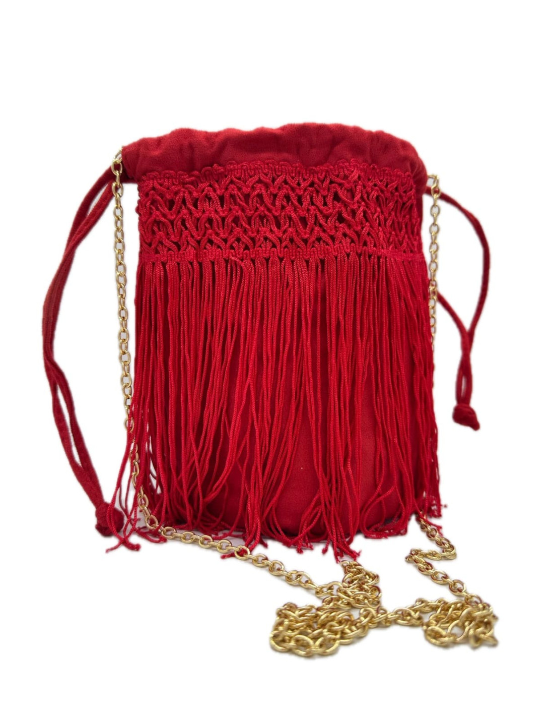 Bombonera de antelina con flecos y cadena dorada, ideal para eventos y ocasiones especiales.