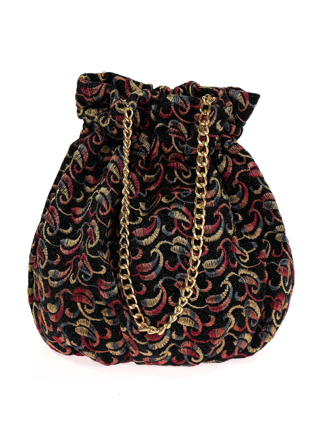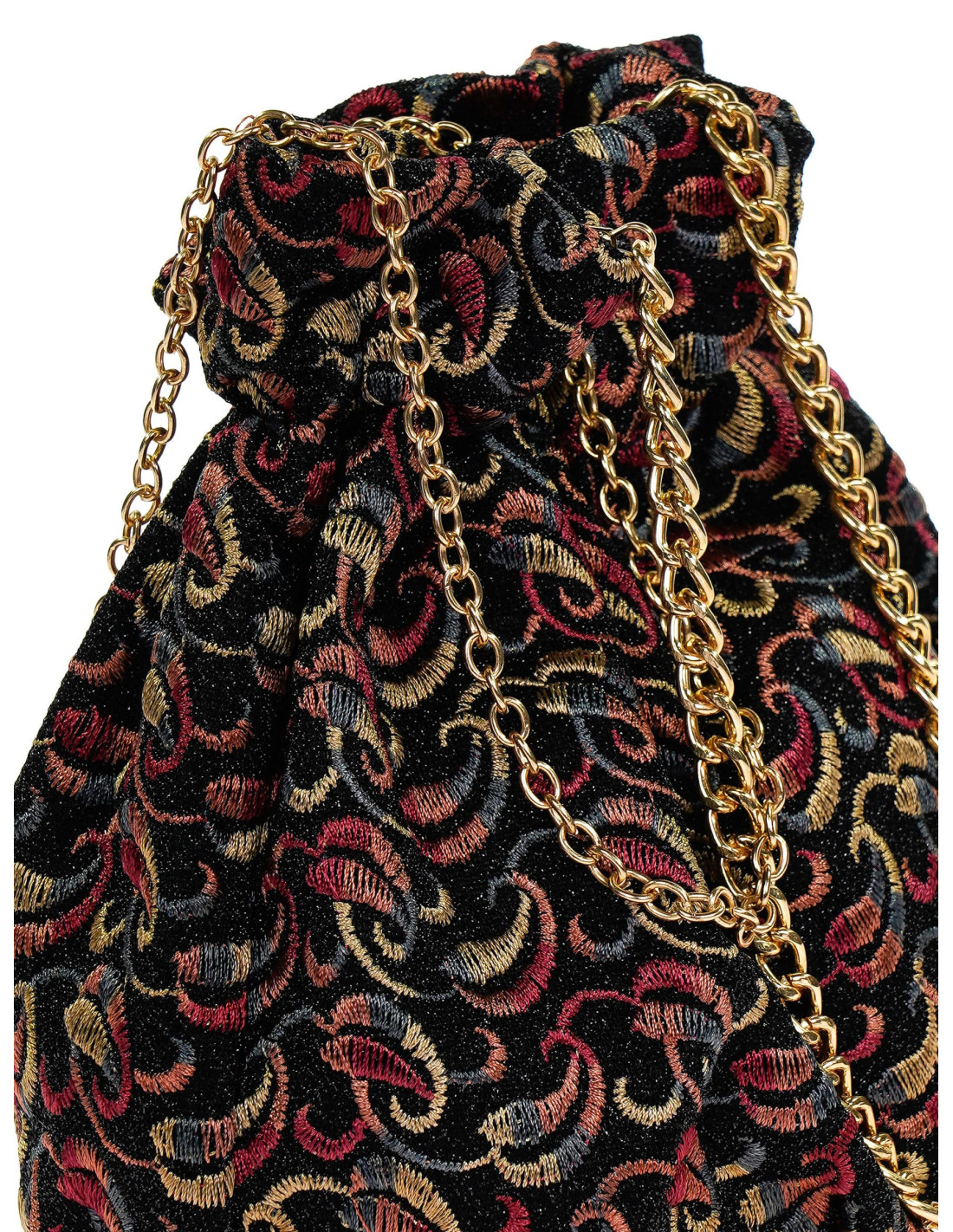 Descubre nuestra bombonera, también conocida como bolso saco o limosnera. Detalles bordados en hilos metalizados, asa de mano y hombro en cadena. Un accesorio esencial para la moda de invitada a eventos, adaptable a diferentes nombres y estilos. Gracias a su diseño versátil puedes usarla tanto para un evento como en tus looks de diario.