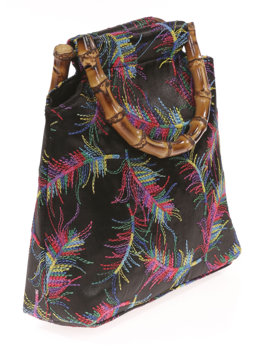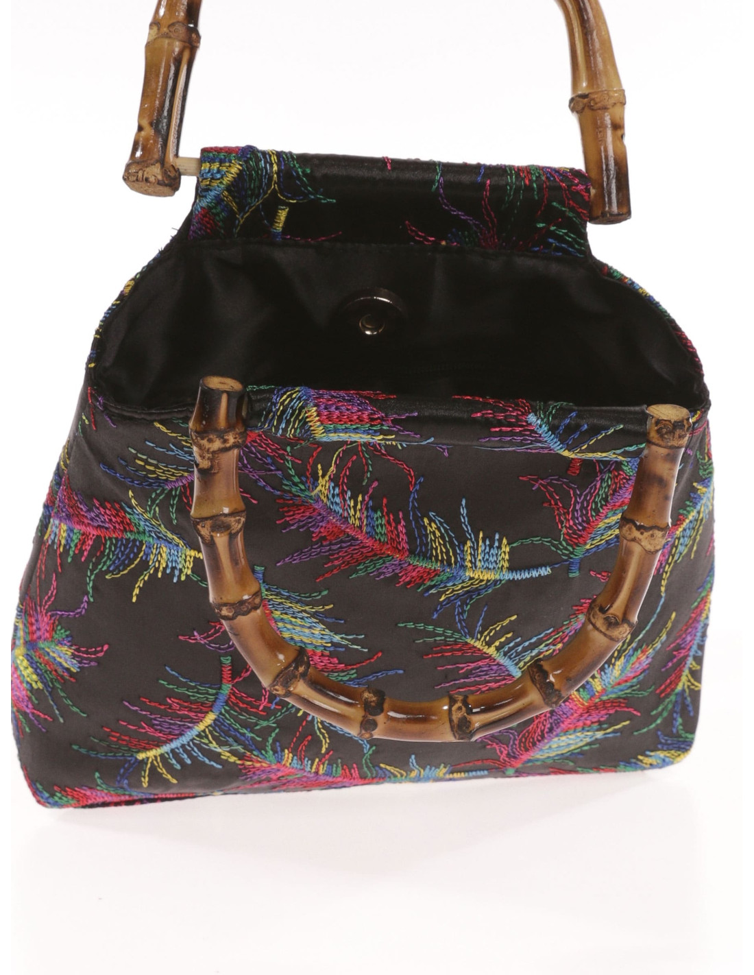 Este bolso con detalles de plumas multicolor bordadas en ambos lados es una pieza única y versátil, perfecta para cualquier ocasión. Con su asa de mano en bambú, aporta un toque natural y elegante, mientras que su cierre mediante imán facilita el uso diario. Además, cuenta con un bolsillo interior con cremallera para mantener tus objetos personales seguros. Con medidas de 20 x 21 x 8 cm, es ideal para llevar lo esencial con estilo. Este bolso es perfecto tanto para eventos formales como para una salida casual, ofreciendo un diseño exclusivo que combina lo artesanal con lo sofisticado. Las plumas bordadas añaden un toque bohemio chic que complementa cualquier look.