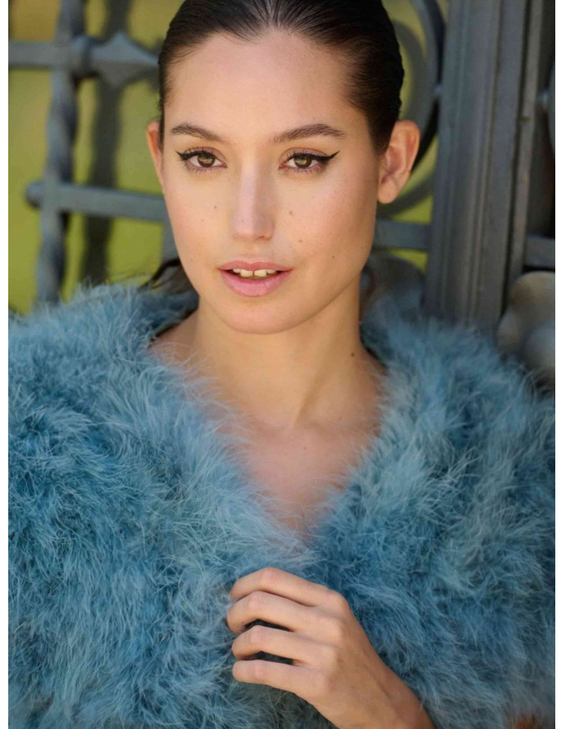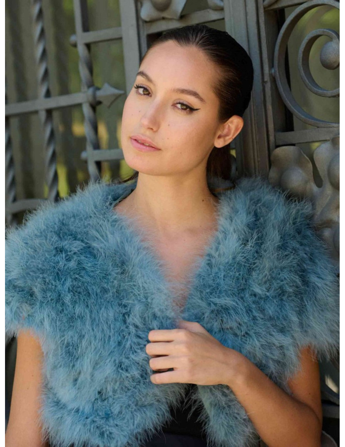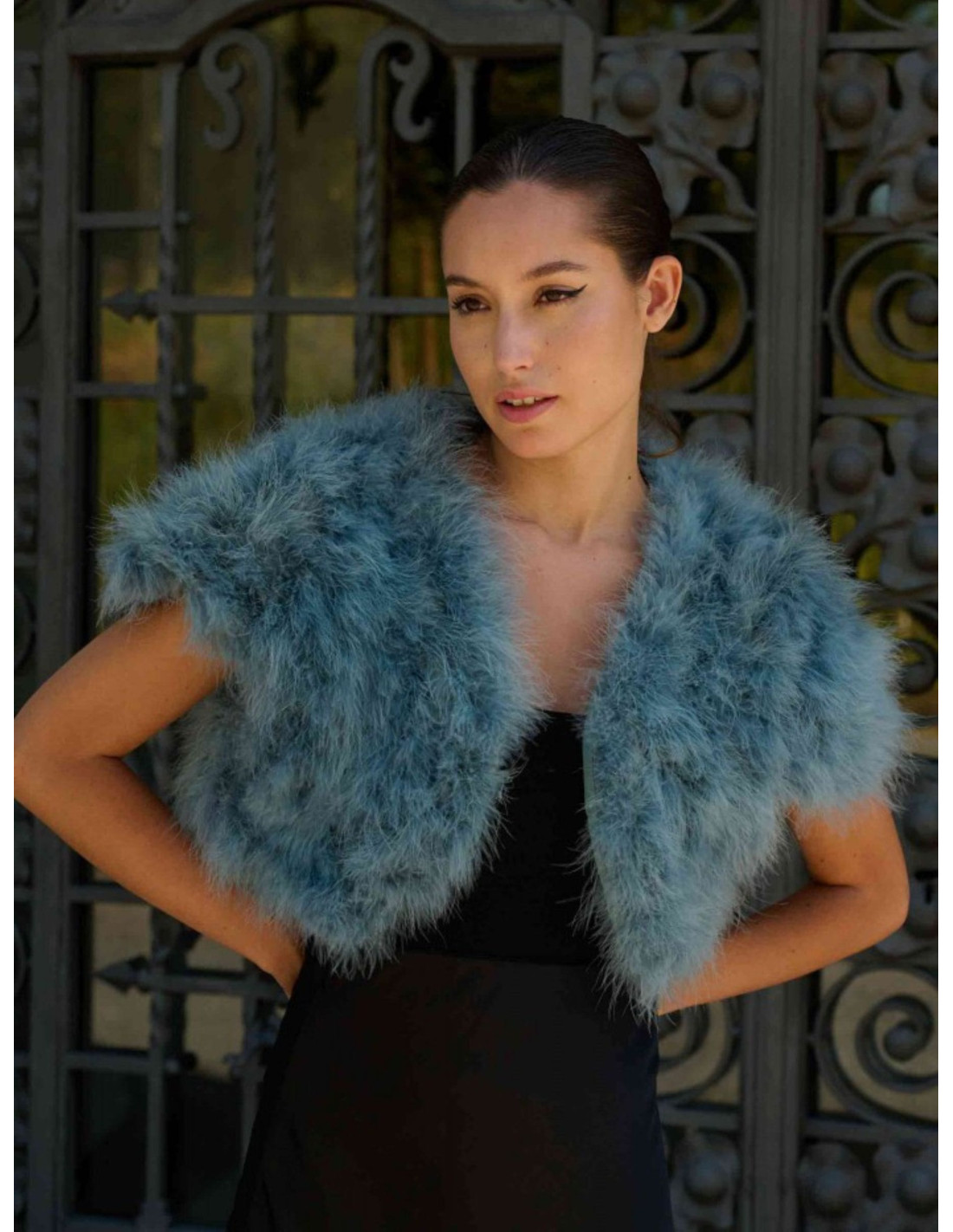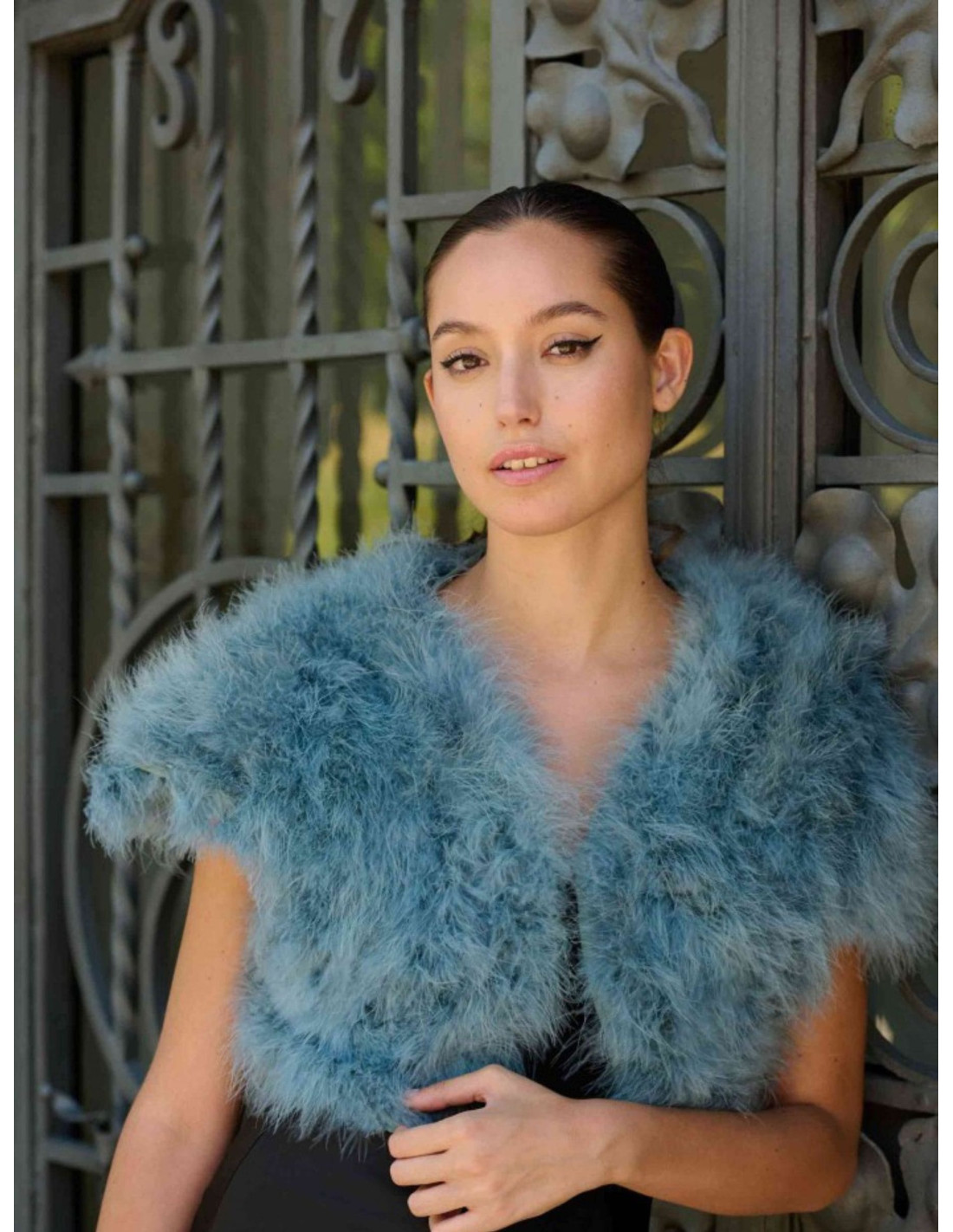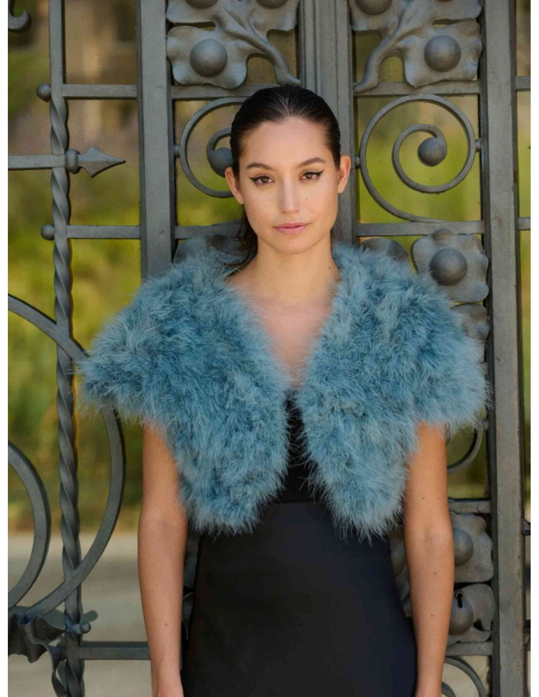 Esta torera de plumas de avestruz es una pieza única y versátil que añade un aire de elegancia y distinción a cualquier look.