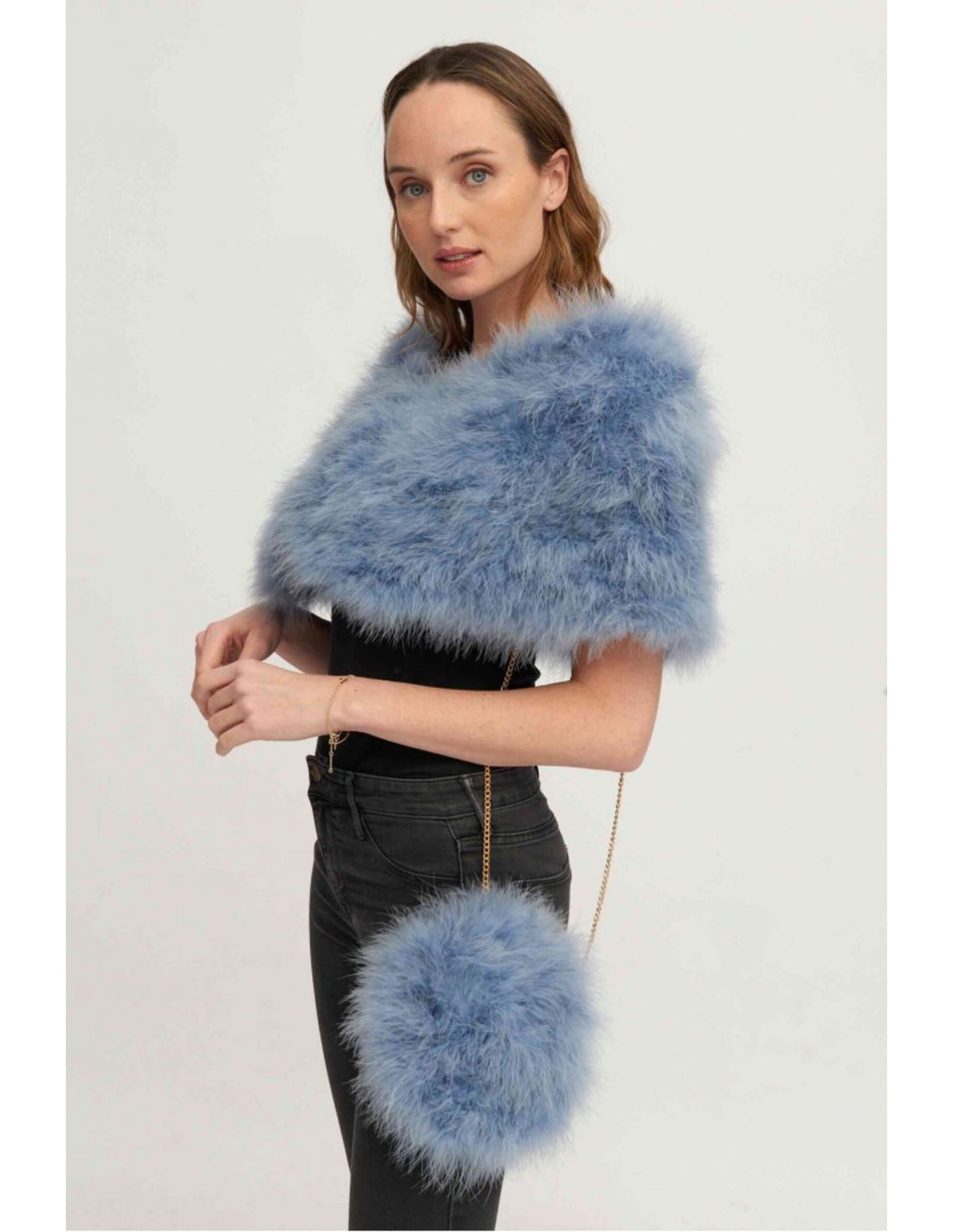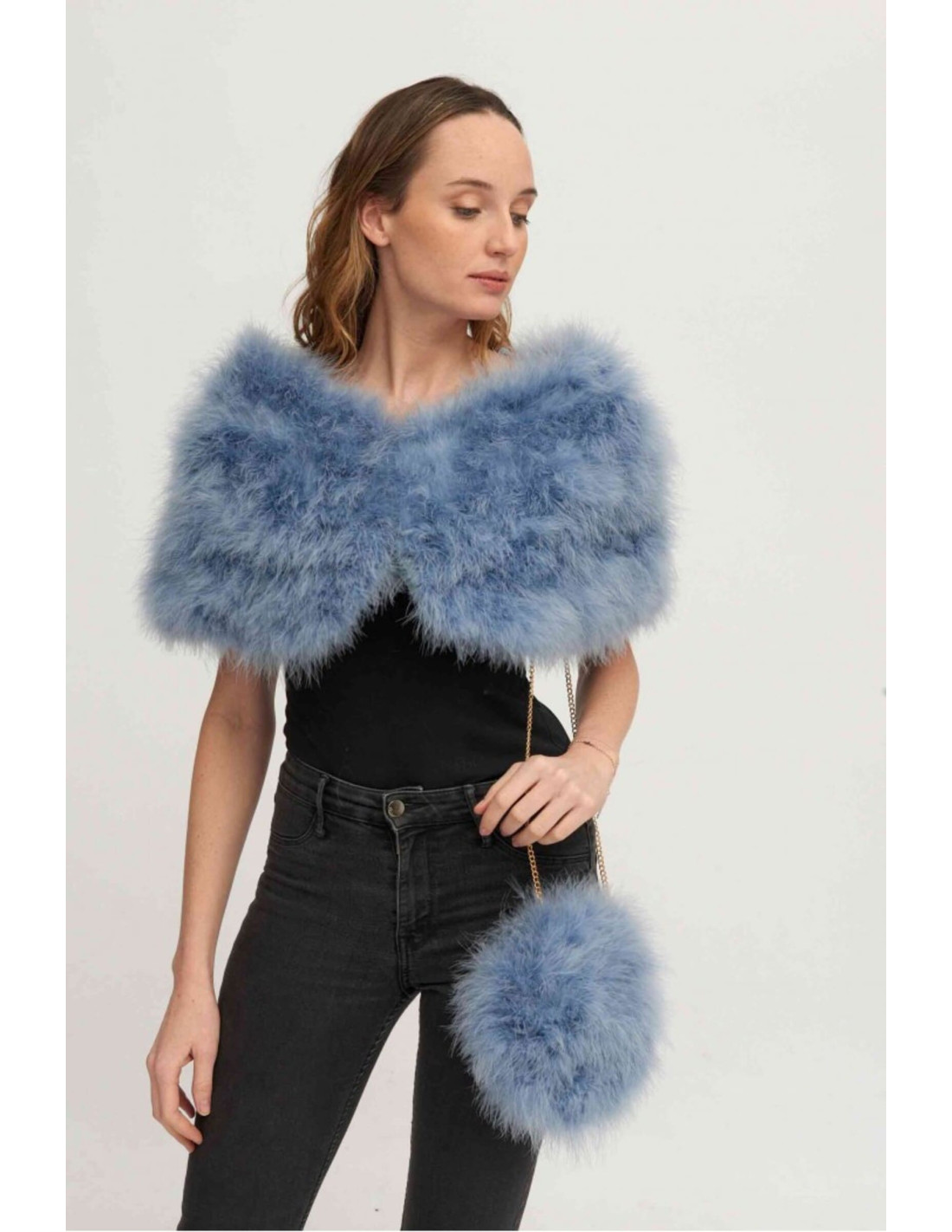La estola de plumas de avestruz en color azul claro es el complemento perfecto para invitadas que buscan un toque sofisticado.