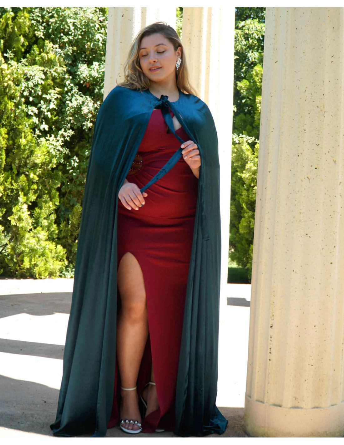 Esta capa es ideal para eventos especiales durante las estaciones frías, ya que su acabado en terciopelo no solo aporta calidez, sino también un toque sofisticado a tu atuendo de invitada.
