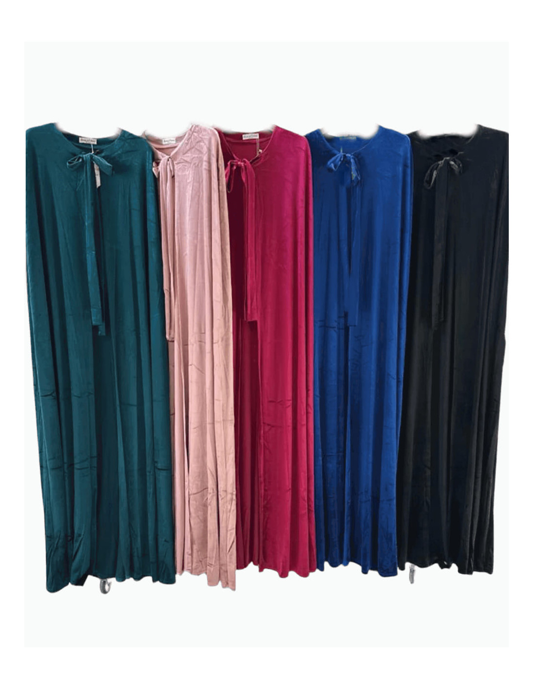 Esta sofisticada capa de terciopelo está disponible en los colores burdeos, azul, rosa palo, negro y verde botella, ofreciendo una variedad perfecta para adaptarse a cualquier look de invitada. Ideal para eventos como bodas, bautizos y comuniones en otoño e invierno, esta capa es el complemento perfecto para añadir glamour y calidez a tu outfit.