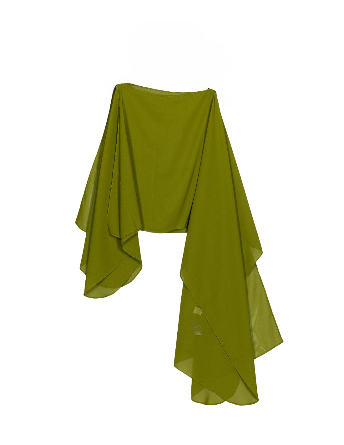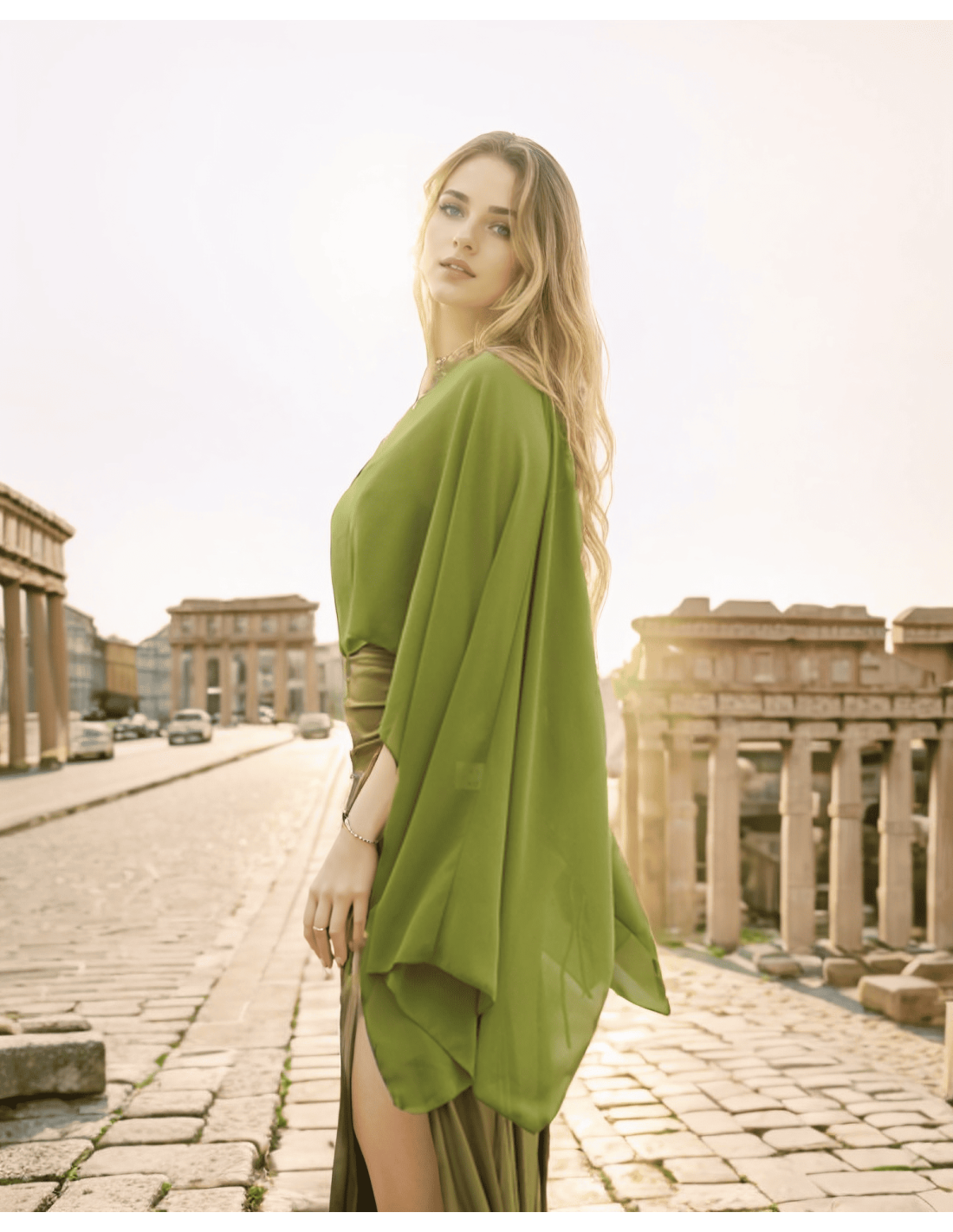 Esta capa de gasa en verde oliva es el complemento ideal para invitadas que buscan un toque de sofisticación y estilo. Su tejido fluido y su diseño multiposición permiten llevarlo de diferentes formas, adaptándose a cualquier look de fiesta. Además, combina a la perfección con el color de la temporada: el marrón chocolate, creando un conjunto elegante y armonioso.
