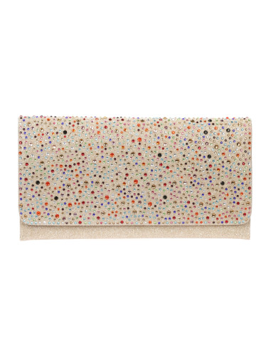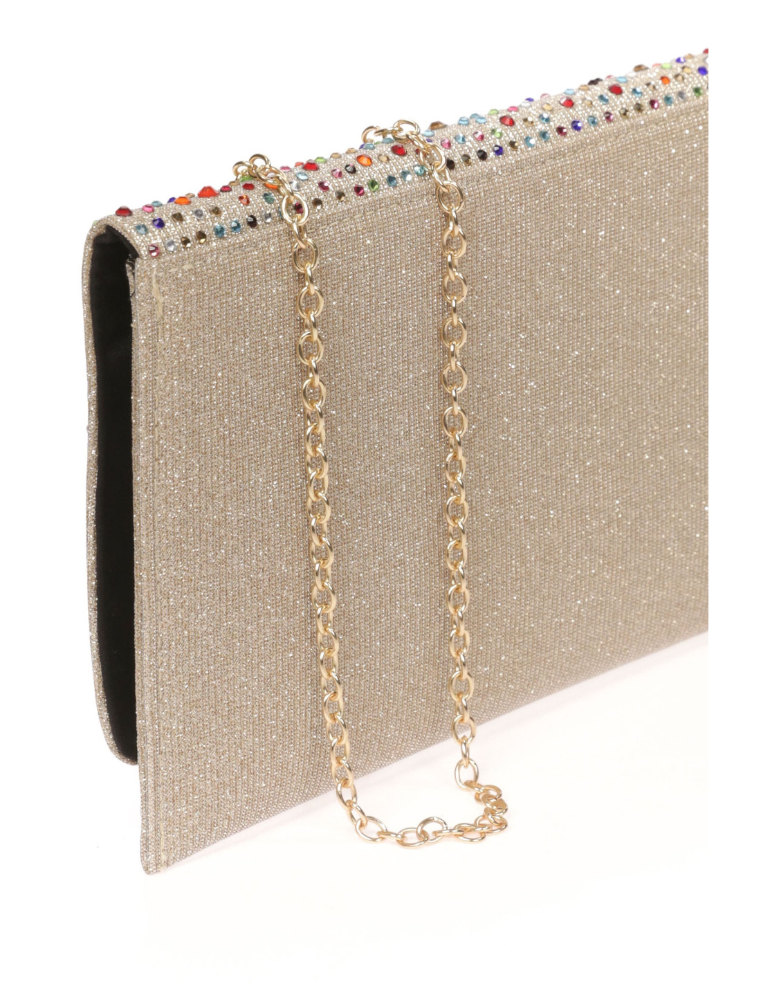 Haz una declaración de estilo con nuestra cartera de fiesta para mujer, ahora disponible en una paleta de colores deslumbrantes. Este accesorio elegante presenta una textura glitter que añade un toque de glamour a tu look, complementado con un detalle de pedrerías en el frontal.