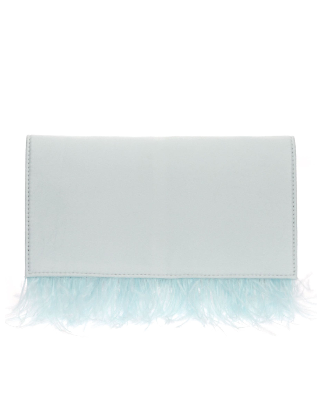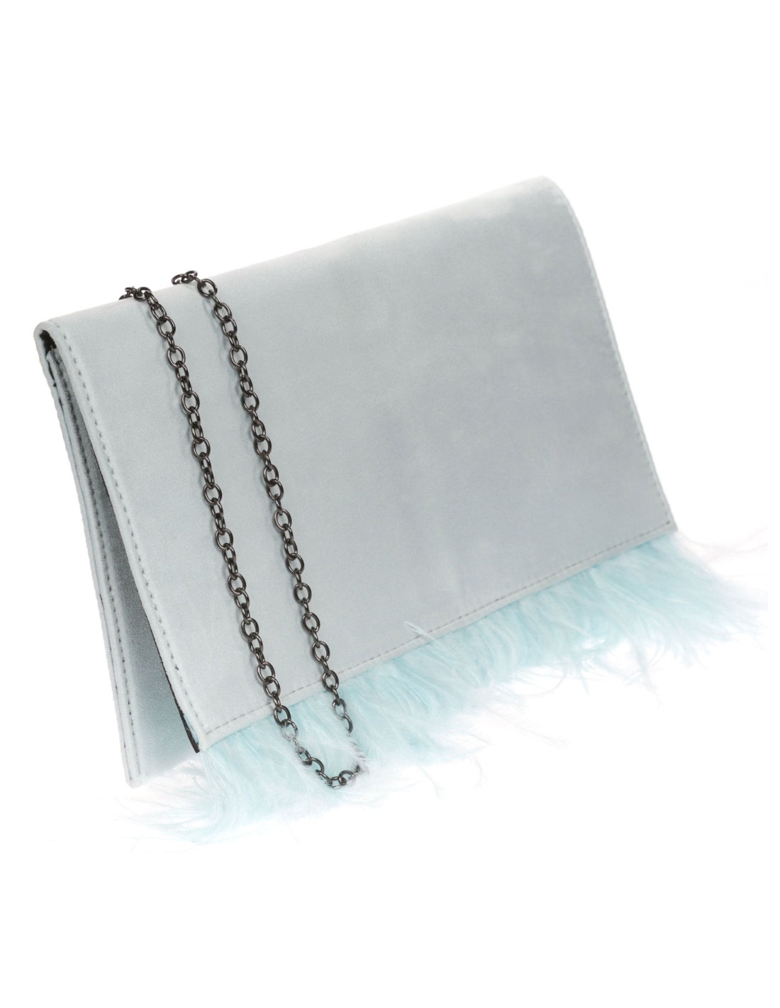 Cartera de mano fiesta con plumas en solapa y cadena para hombro