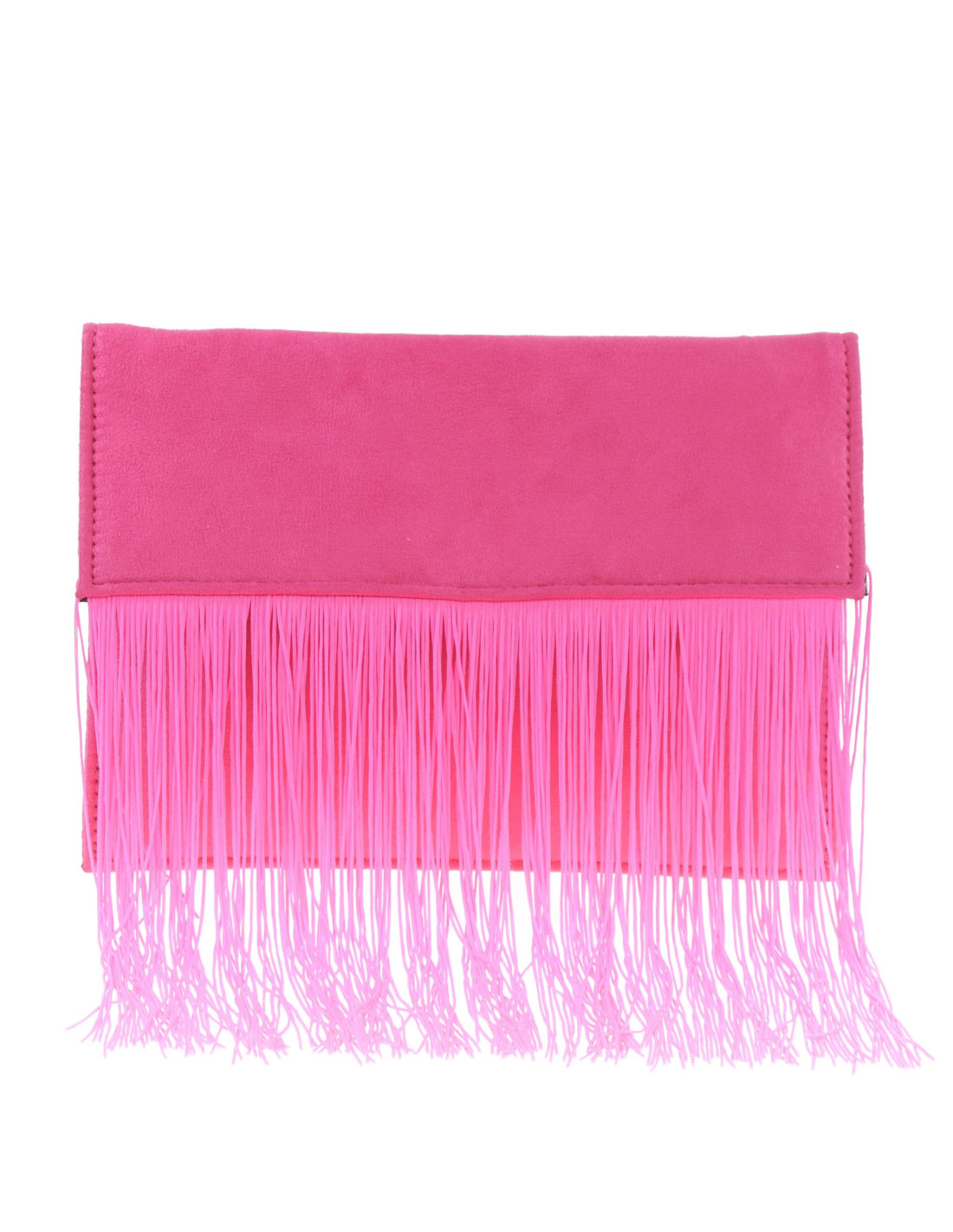 Elaborada con efecto ante, nuestra cartera presenta un detalle de flecos en la solapa que añade un toque de sofisticación y movimiento a tu outfit. Su cadena para llevarla al hombro te permite llevarla cómodamente mientras bailas toda la noche. Además, su forro interior incluye un práctico bolsillo para guardar tus elementos esenciales de forma segura.