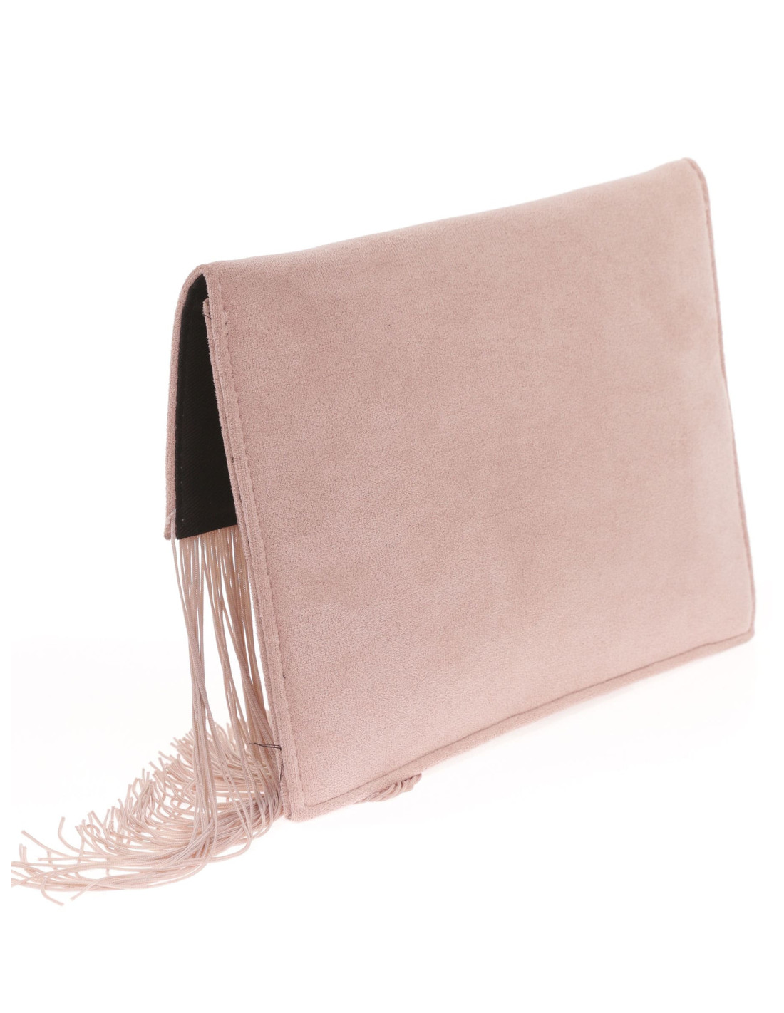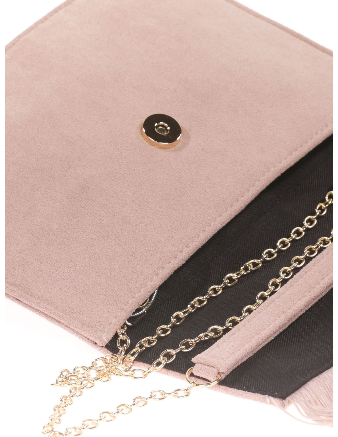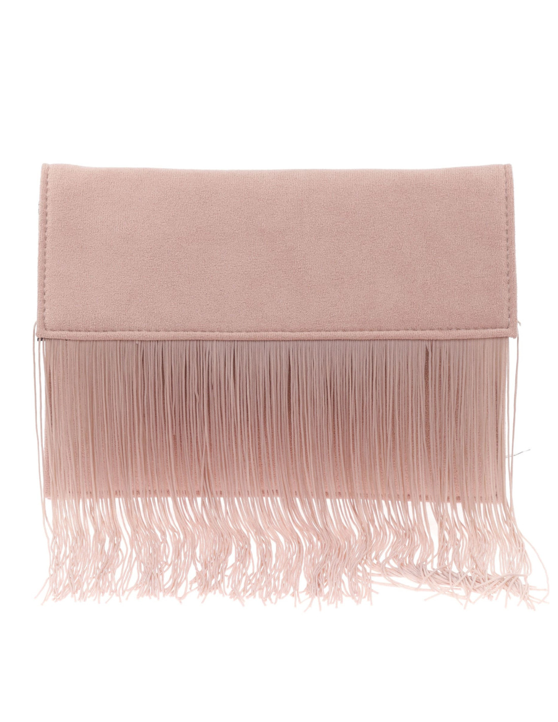 Elaborada con efecto ante, nuestra cartera presenta un detalle de flecos en la solapa que añade un toque de sofisticación y movimiento a tu outfit. Su cadena para llevarla al hombro te permite llevarla cómodamente mientras bailas toda la noche. Además, su forro interior incluye un práctico bolsillo para guardar tus elementos esenciales de forma segura.