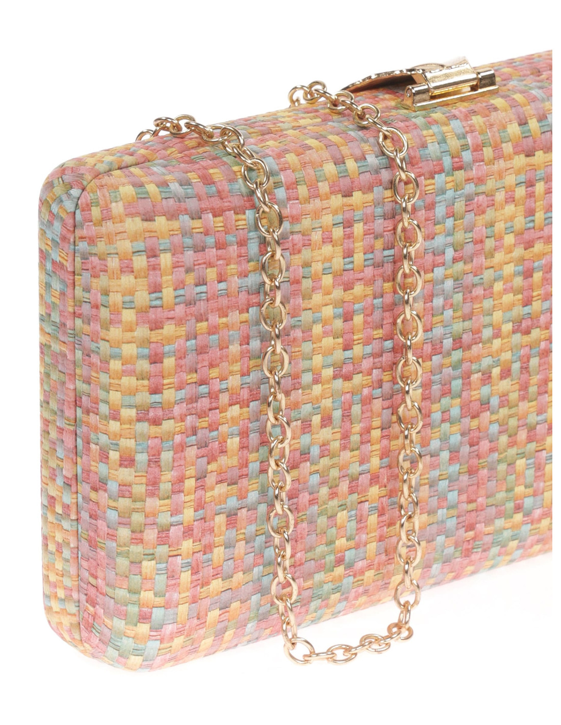 Este exclusivo bolso de fiesta destaca por su original diseño y combinación de colores vibrantes. Fabricado en polipiel de alta calidad, su cierre metálico dorado en forma de hoja añade un toque sofisticado y elegante. Con un tamaño ideal (20 cm de ancho, 11 cm de alto, y 4 cm de fondo) y una cadena dorada desmontable para llevar al hombro, este bolso es el complemento perfecto para cualquier evento. Su diseño multicolor es único y original, asegurando que serás el centro de todas las miradas.