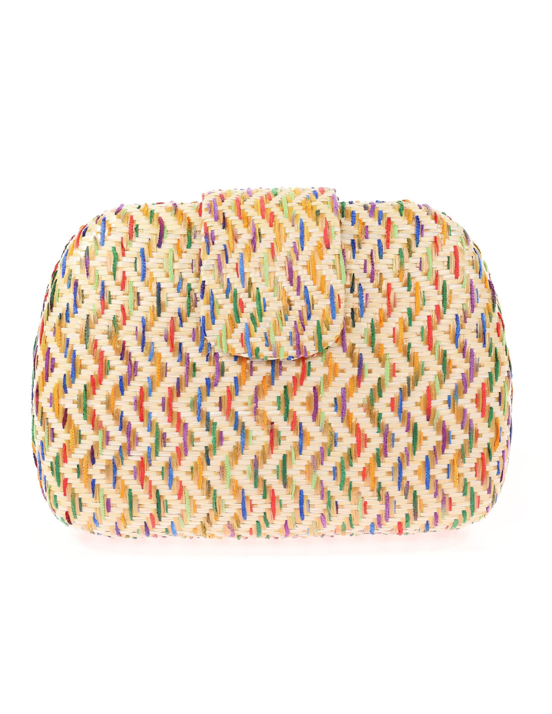 Este clutch de fiesta efecto rafia es el complemento perfecto para tus eventos especiales. Su diseño tejido con colores vibrantes le aporta un toque fresco y elegante, ideal para darle personalidad a cualquier look. Gracias a su cadena metálica, puedes llevarlo cómodamente al hombro o usarlo como bolso de mano.