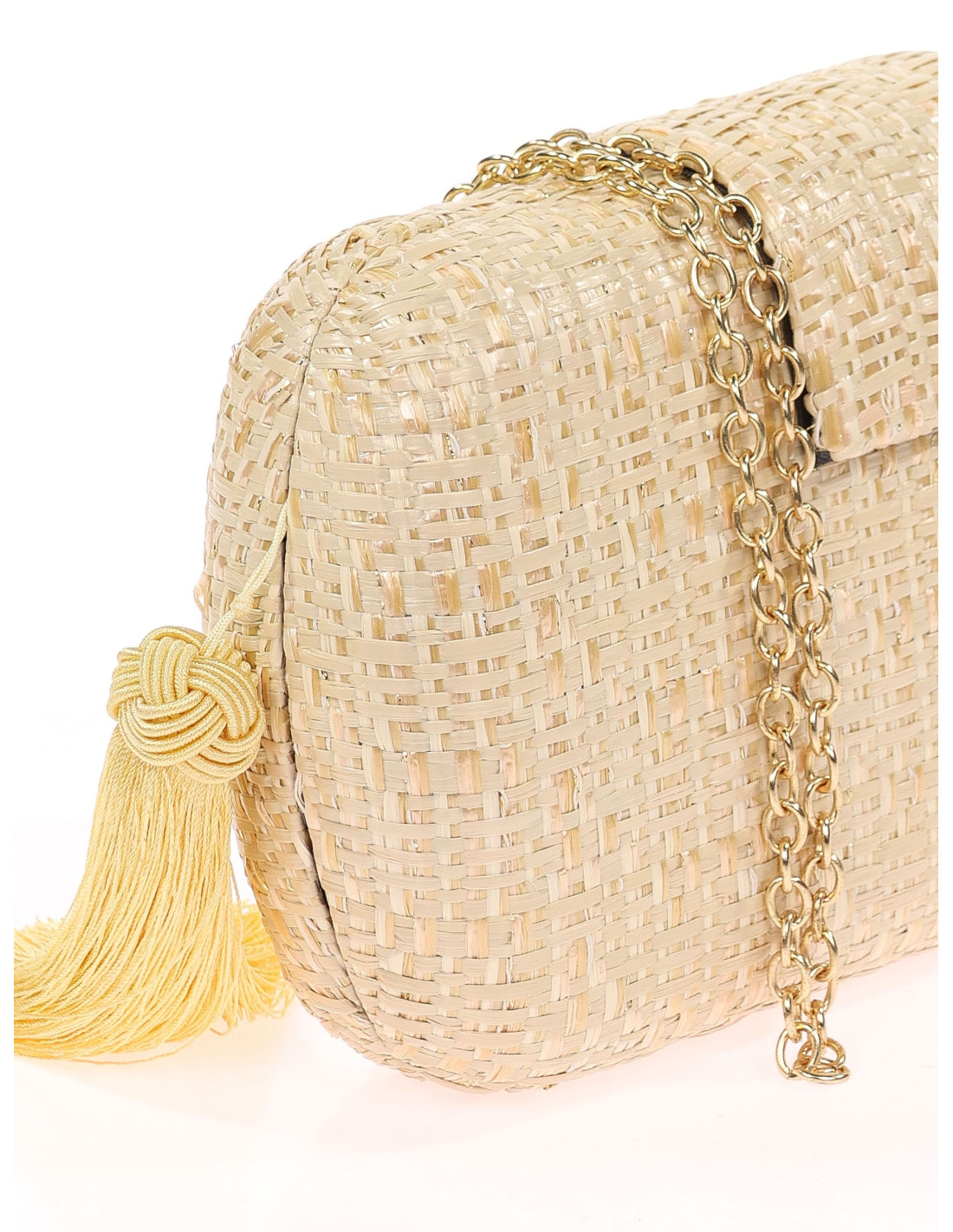 Bolso clutch de fiesta multicolor de rafia con borla oro