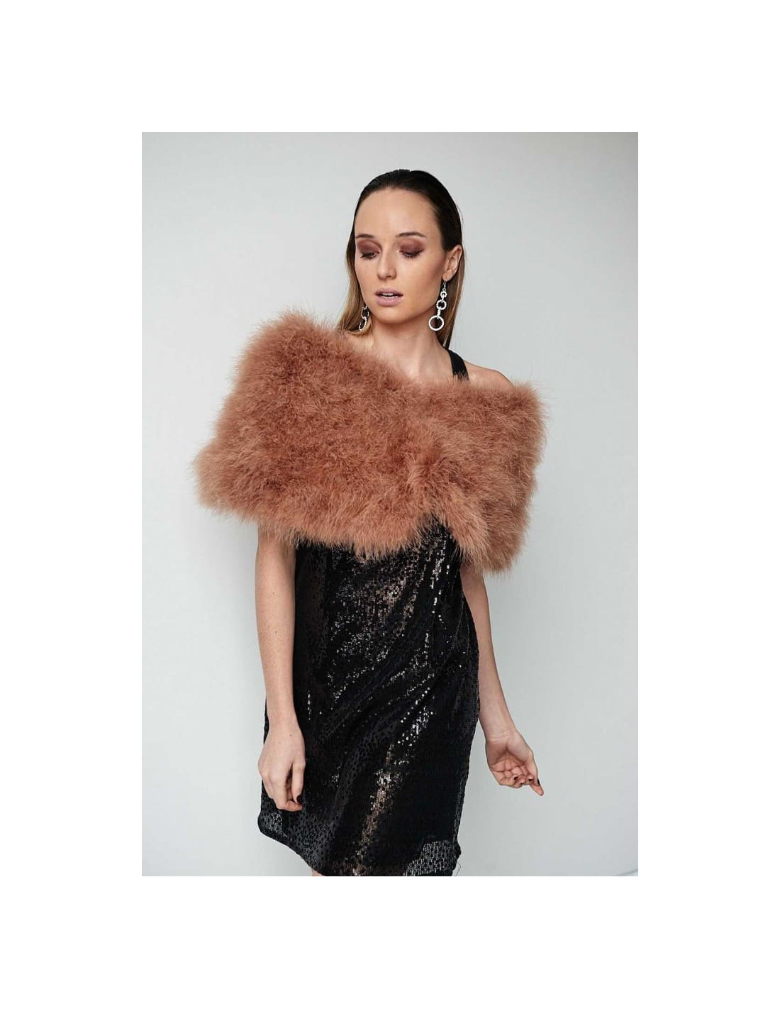 Si buscas un accesorio sofisticado y fácil de combinar, esta estola de plumas de avestruz auténticas en color camel es la elección perfecta. Su tono neutro y cálido aporta un toque especial sin recargar el look, ideal para bodas, eventos y celebraciones especiales.