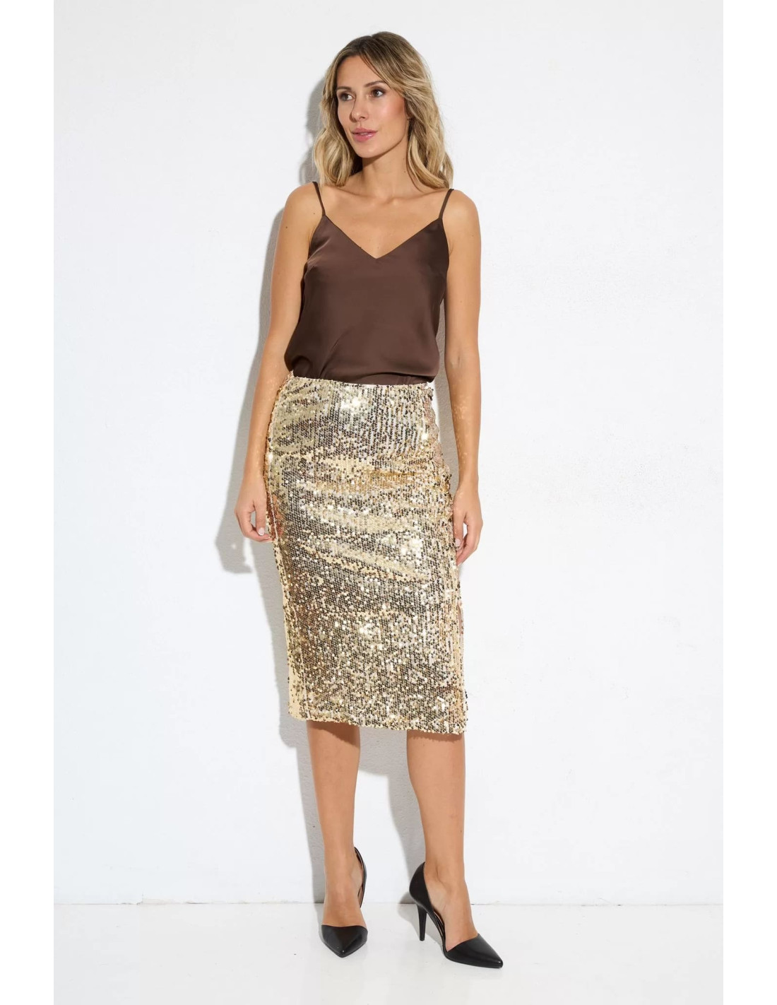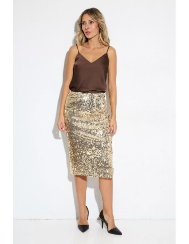 Con esta falda midi lentejuelas dorada, tus outfits falda lentejuelas para Navidad y Nochevieja estarán llenos de sofisticación y brillo. No solo es ideal para eventos especiales, sino que también es versátil para cualquier tipo de celebración de la temporada. ¡Atrévete a destacar con un look inolvidable!