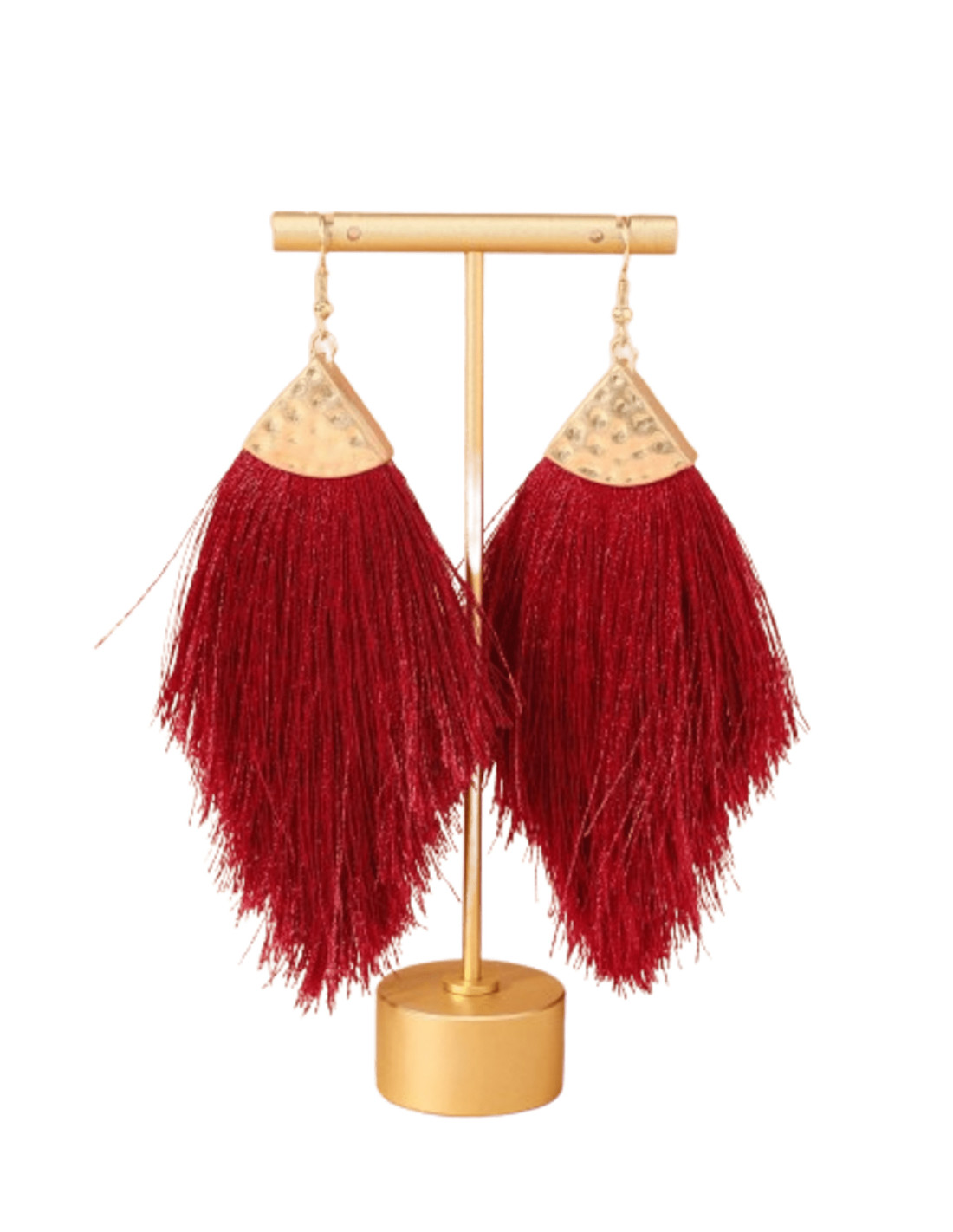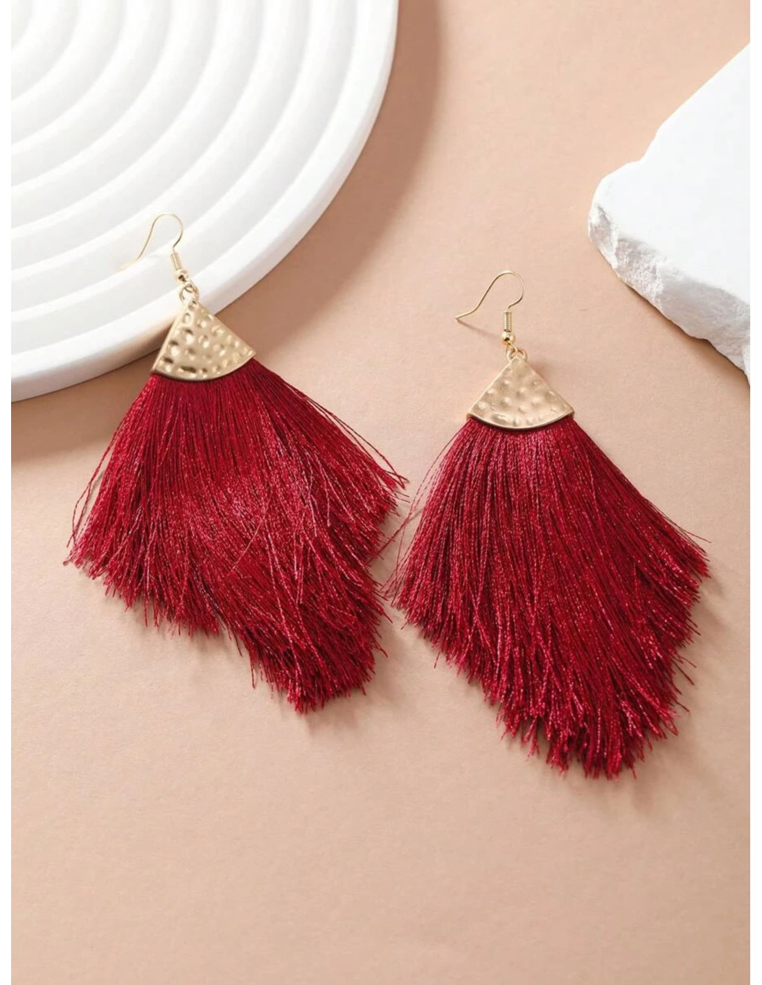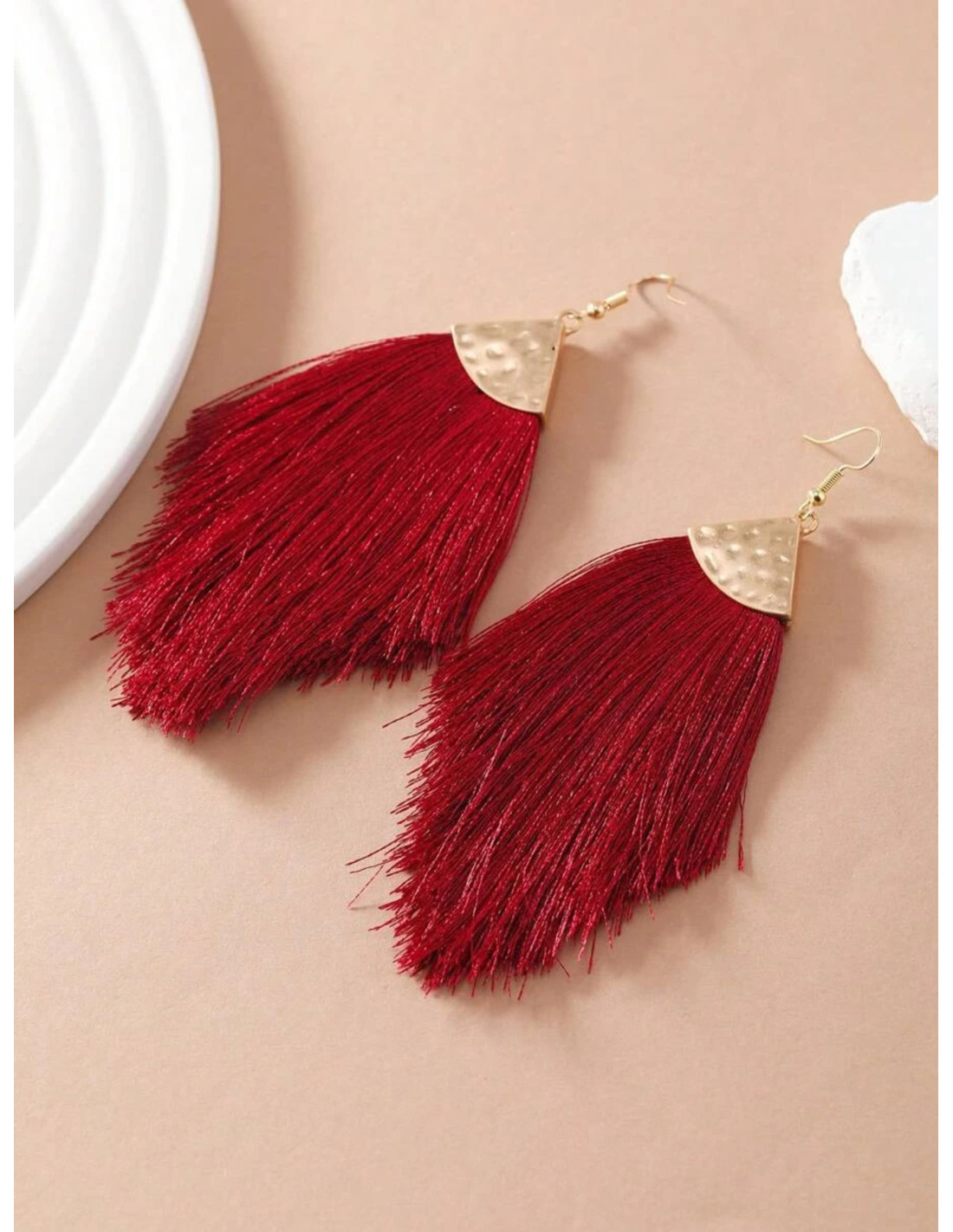Sumérgete en la elegancia y la versatilidad con nuestros exclusivos pendientes largos de flecos en un cautivador tono burdeos. Diseñados para la mujer que busca destacar en eventos especiales como bodas, bautizos y comuniones, estos pendientes son la elección perfecta para agregar un toque de glamour a tu estilo.