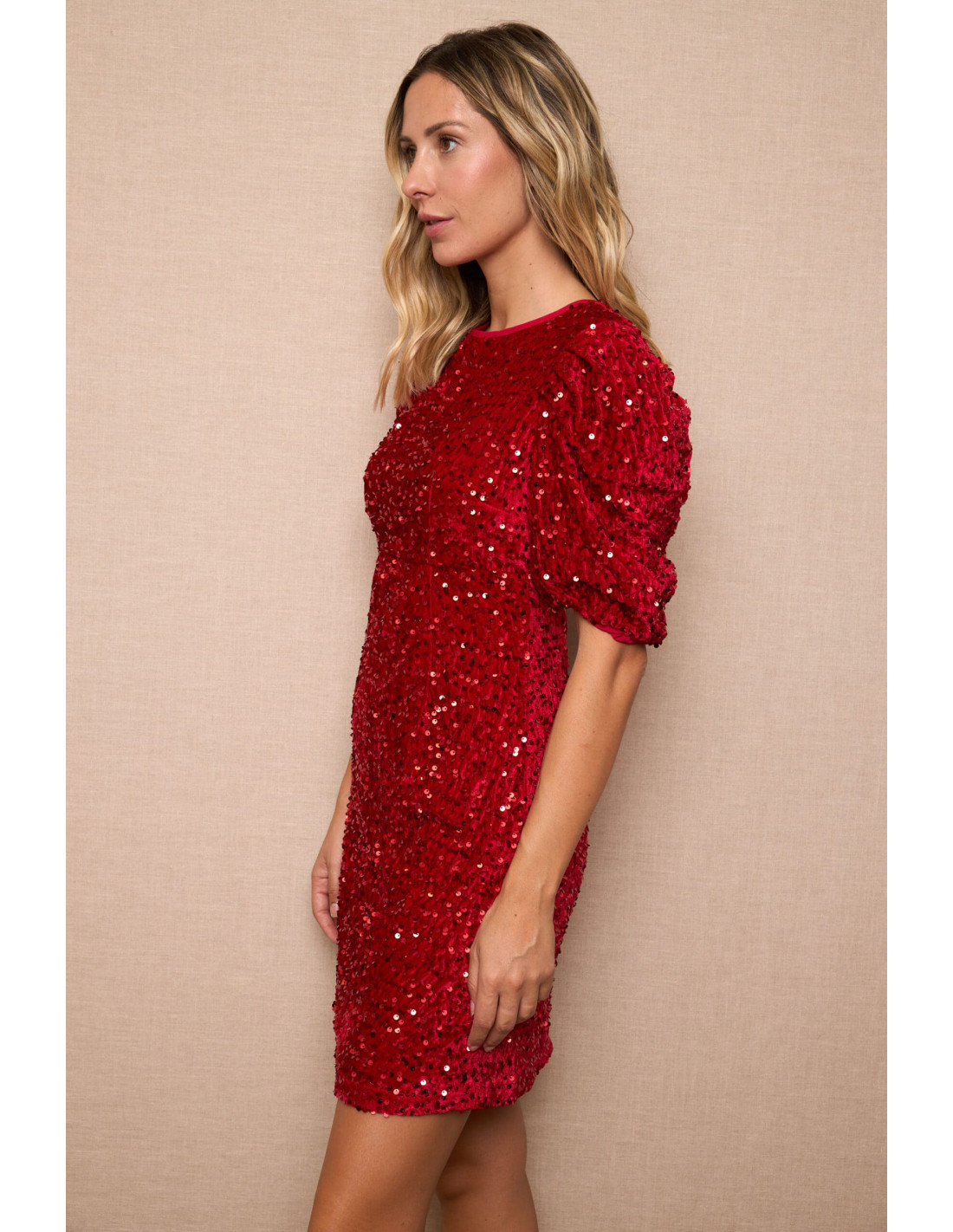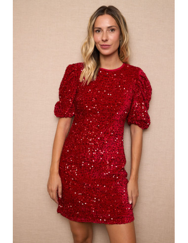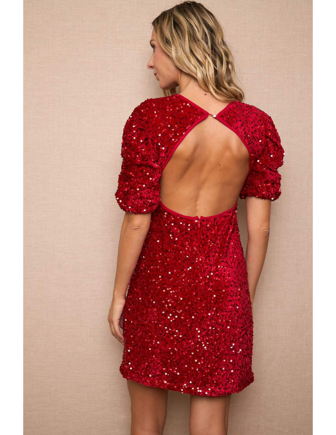 Vestido corto de lentejuelas rojas con espalda descubierta y mangas abullonadas