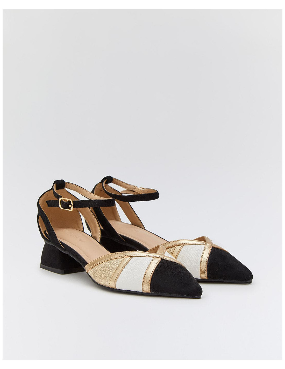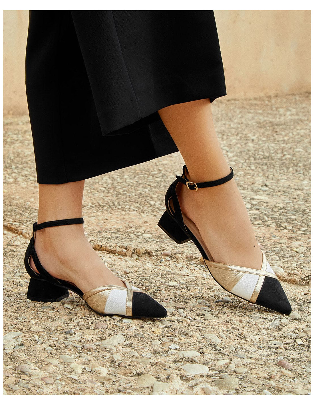 Aporta un toque de distinción y confort a tus eventos especiales con estos zapatos de fiesta para mujer. Fabricados en suave ante, combinan los tonos negro, dorado y blanco para un diseño exclusivo y sofisticado. Su tacón bajo de 4,5 cm proporciona estabilidad sin renunciar al estilo, mientras que la punta fina estiliza la figura y aporta un aire refinado.